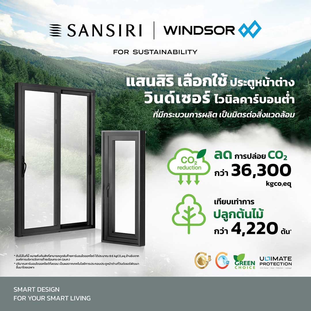 Regarding the WINDSOR brand, Apichart Pornvoranant, Sales Division Manager at Nawaplastic Industries Co., Ltd., a subsidiary of SCG Chemicals, or SCGC, said, “WINDSOR is committed to promoting sustainability in residential projects, catering to environmentally conscious homeowners by developing eco-friendly vinyl door and window materials under our vision, ‘WINDSOR for Sustainability.’ The company is the first in Thailand to receive certification for both the Carbon Footprint of Product (CFP) and Carbon Footprint Reduction (CFR) labels for its vinyl door and window product lines, alongside the SCG Green Choice certification. Additionally, WINDSOR’s vinyl doors and windows utilize an exclusive ‘Pre-cut’ manufacturing process that is unique to the brand, ensuring zero waste during assembly and significantly reducing carbon dioxide (CO₂) emissions due to lower energy consumption. Every household that installs WINDSOR’s vinyl doors and windows can reduce emissions by more than 39 kilograms of carbon dioxide (kgCO₂eq), which is equivalent to planting approximately five trees.* Collectively, across more than 20 Sansiri residential projects nationwide, the total area of WINDSOR door and window installations contributes to a cumulative reduction of approximately 36,300 kilograms of carbon dioxide (kgCO₂eq), or more than 4,220 trees planted*.”