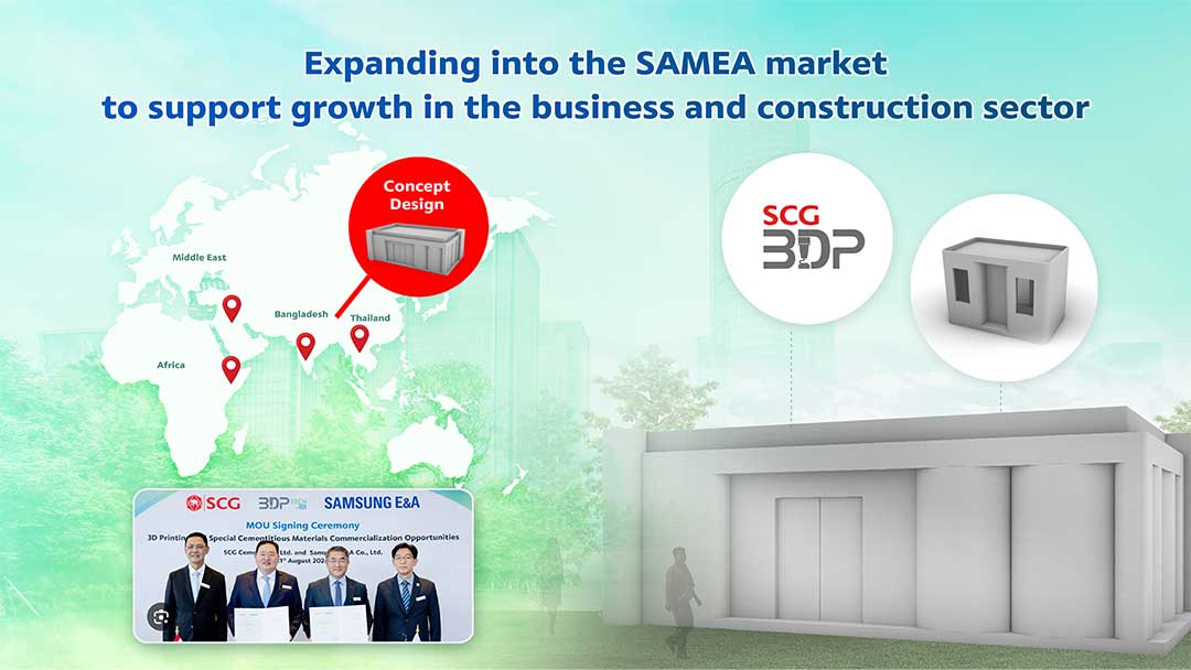SCG Cement and Green Solutions is advancing its construction technology, particularly in 3D printing, by developing special cementitious materials that harden and provide compressive strength to meet global market demand. Recently, it signed an agreement with Samsung E&A from South Korea to integrate innovative technologies that enhance efficiency, speed, accuracy, reduce costs and construction waste, and address the skilled labor shortage in the construction industry. This collaboration emphasizes the use of high-quality, patented 3D Printing Mortar, which has been developed over the past decade. The technology consultation provided supports the construction of highly complex structures, including multi-storey buildings, especially in Saudi Arabia. SCG International has already delivered its first batch of 3D Printing Mortar to Saudi Arabia, with plans to expand into South Asia, the Middle East, and Africa (SAMEA) to support business and construction growth in these regions. Additionally, SCG promotes eco-friendly housing solutions, such as the “CPAC Small Concrete Mixer Trucks” for small areas, which reduce noise pollution, and the “CPAC Low Carbon Concrete,” which helps reduce PM 2.5 issues. In collaboration with AP Thailand, this Low Carbon Concrete will be used in over 56 housing projects by 2024, reducing carbon dioxide emissions by 1,112,600 kg CO2, equivalent to planting 117,116 trees.