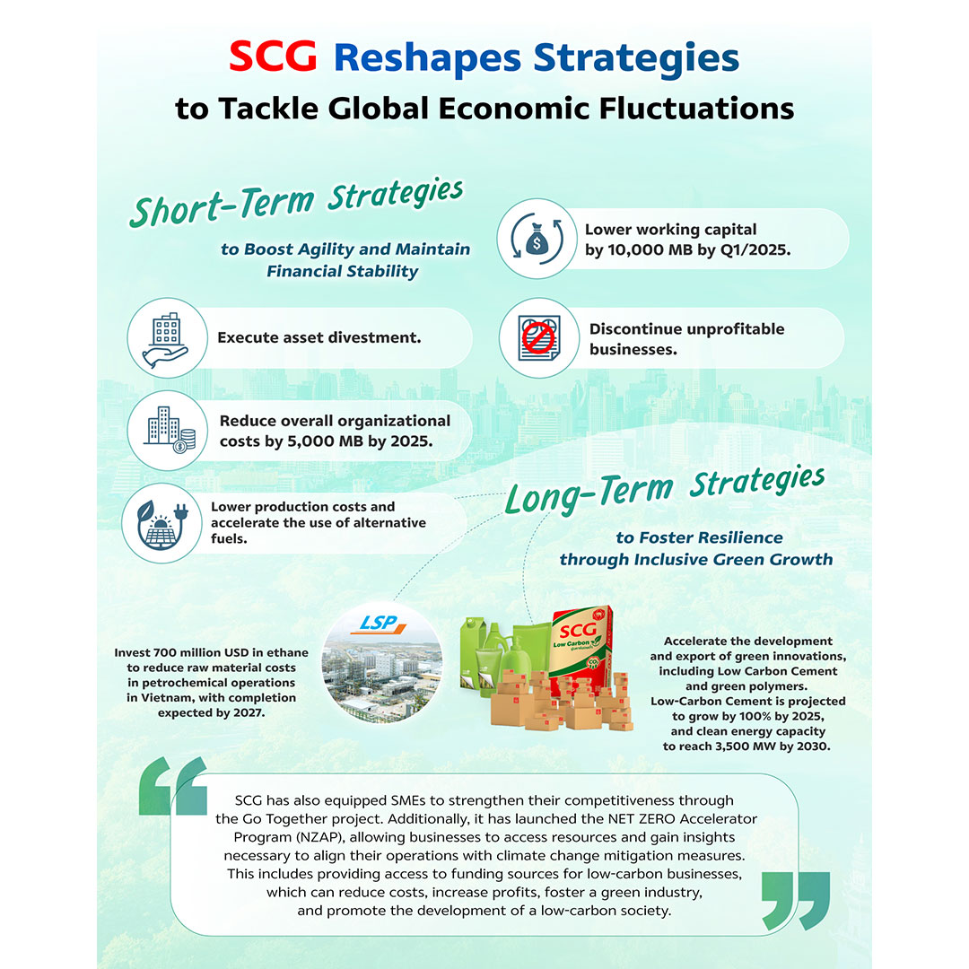 In the long term, green initiatives and Inclusive Green Growth approach present business opportunities and advantages. Therefore, the company is accelerating investment in the ethane project at Long Son Petrochemicals (LSP) to reduce raw material costs, with an investment budget of 700 million USD. This move enhances competitiveness within the global petrochemical industry and helps reduce carbon dioxide emissions in the production process. SCG is also promoting high-value green innovations such as Generation 2 Low Carbon Cement, which has been continuously well-received, achieving an 86% replacement rate of conventional cement with Low Carbon Cement. Additionally, the company is advancing green polymers under the SCGC GREEN POLYMER™ brand which shows consistent growth.