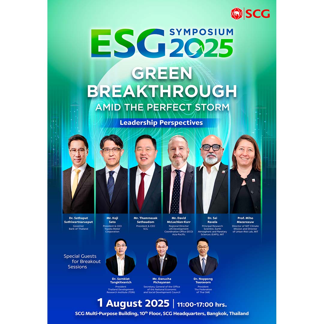 Therefore, SCG is organizing the ESG Symposium 2025 under the theme “Green Breakthrough amid the Perfect Storm” on August 1, 2025, from 11:00 AM to 5:00 PM at SCG Headquarters in Bang Sue. This platform brings together leaders from diverse sectors who play crucial roles in driving ASEAN’s transformation to exchange perspectives, collaborate in brainstorming, and develop recommendations for advancing a low-carbon society.