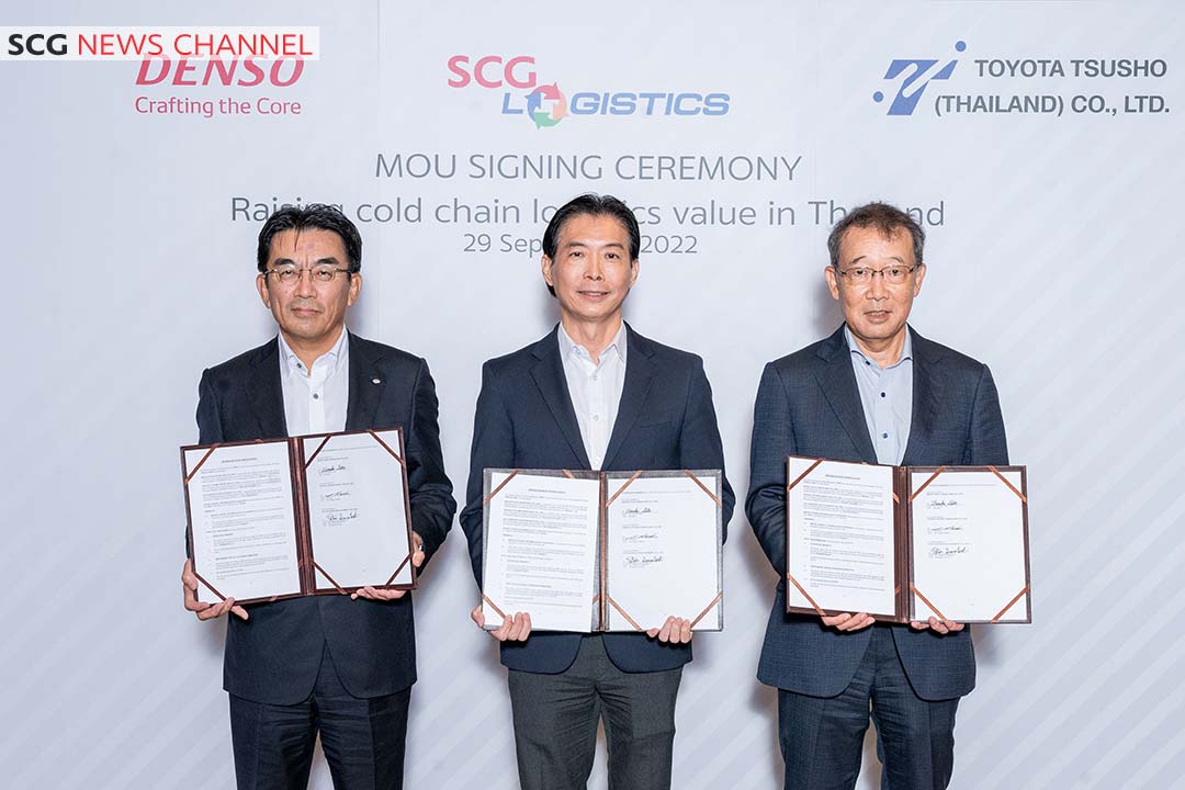 29 September 2022, Bangkok – SCG Logistics Management, Thailand’s leading provider of integrated logistics services, DENSO Sales (Thailand), a global manufacturer and distributor of automotive parts, and Toyota Tsusho (Thailand), a trading company affiliated with Toyota Group, have signed a partnership agreement to raise the standard of Thailand cold chain ecosystem. The agreement was signed by Paitoon Jiranantarat, Managing Director of SCG Logistics Management, Hisaaki Sato, President of DENSO Sales (Thailand), and Shigeki Maeda, Managing Director of Toyota Tsusho Thailand.