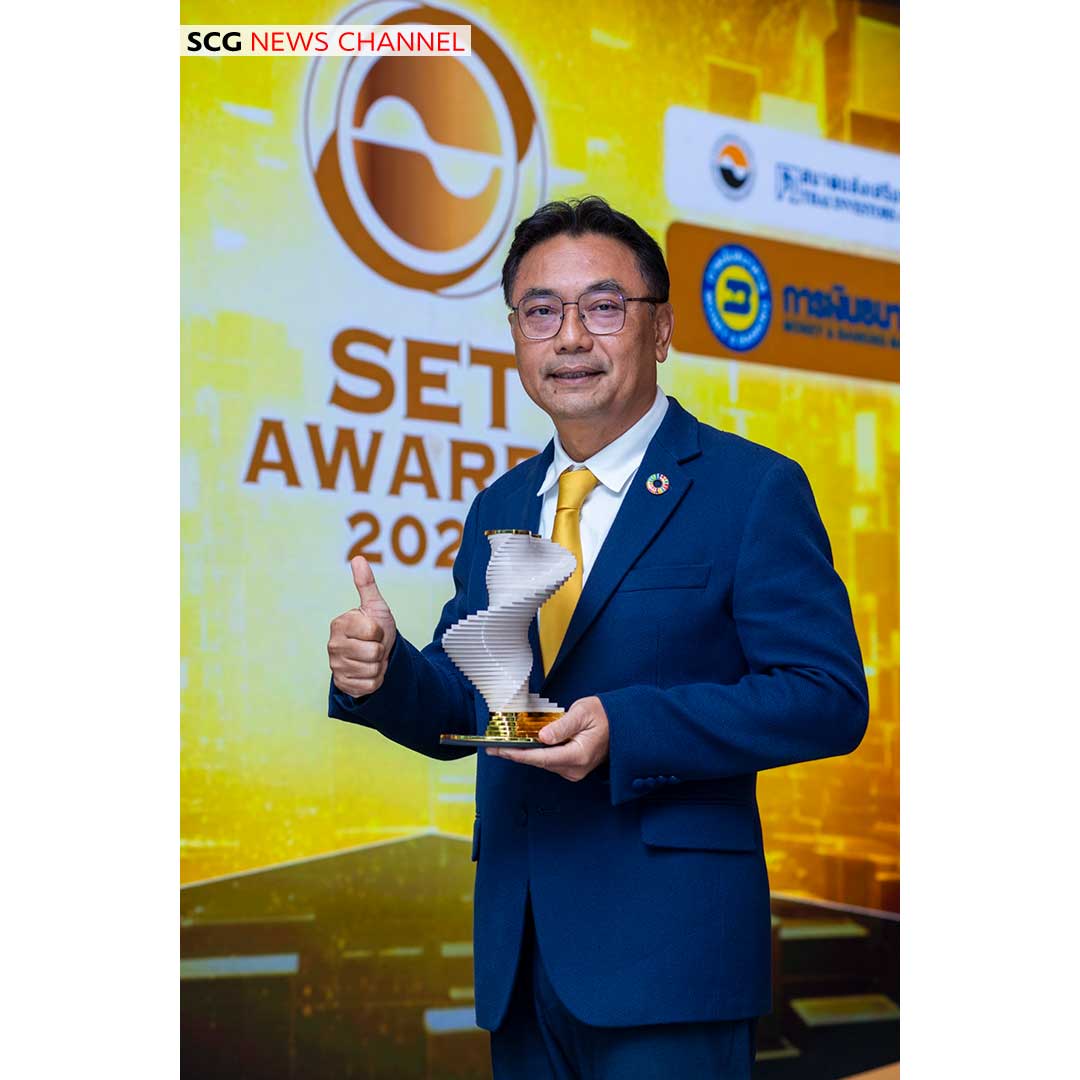 Meanwhile, SCG Packaging Public Company Limited (SCGP), represented by Mr. Thalengsak Ratchaburi, Chief Operating Officer of Pulp and Paper Business (first from right), received the Best Innovation Company Awards in the SET Awards of Honor category. This reflects their excellence in innovation creation and development that has consistently advanced the industry from 2022-2024. The company developed “New Hybrid Eucalyptus Strains for Sustainability,” which adds sustainable value throughout the supply chain through cross-breeding combined with advanced biomolecular techniques and tissue culture. This resulted in new eucalyptus strains with 40% higher growth and yield, disease and pest resistance, and suitability for areas with both low and normal rainfall.