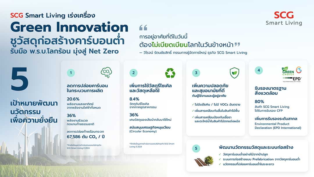 SCG Smart Living is prepared to lead as a model construction materials business driven by “Circular Economy and Low Carbon” concepts through concrete collaboration with leading real estate partners in selecting low-carbon construction materials products and solutions. This approach not only reduces environmental impact but also comprehensively addresses the requirements of the Climate Change Act, which will take effect in early 2026.