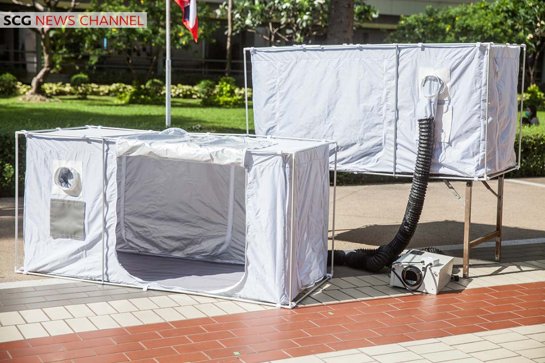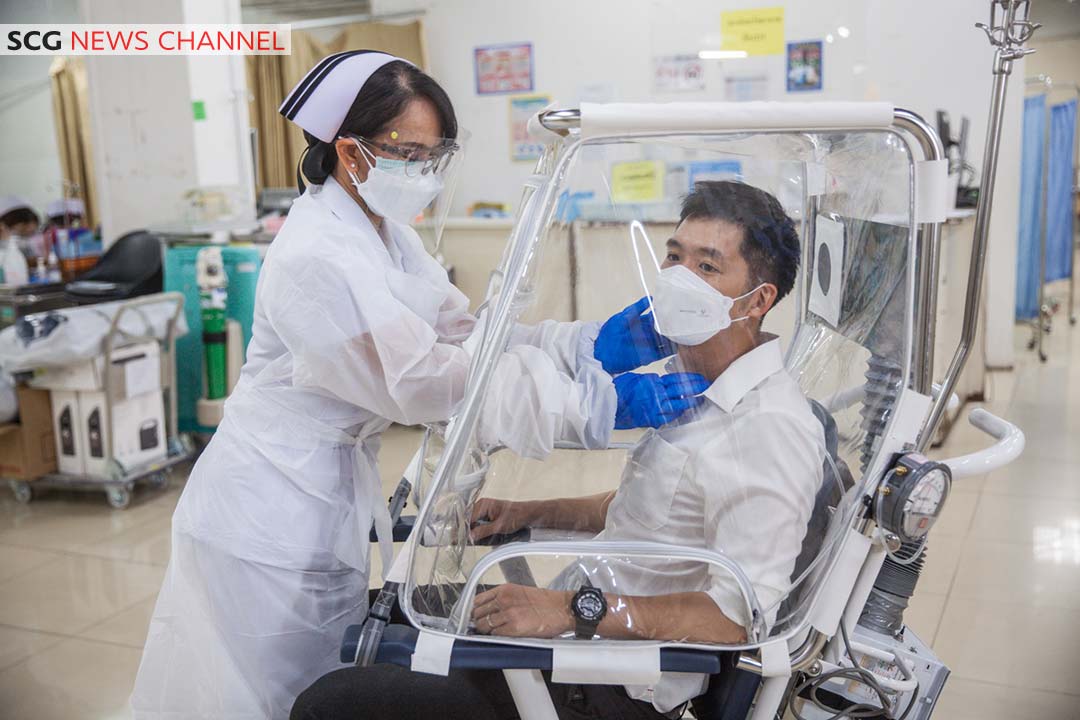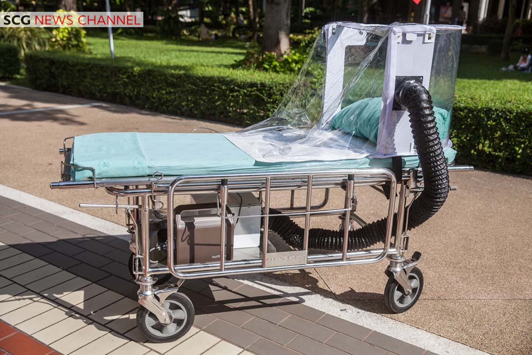 The three latest types of Mobile Isolation Units that SCGC has developed and given to Siriraj Hospital are 1) Negative Pressure Isolation Hood, which prevents the dispersal of pathogens while waiting for consultation; 2) Negative Pressure Isolation Wheelchair, which curbs the spread of germs during patient transfer; and 3) Positive Pressure Isolation Cocoon, additional equipment that provides healthcare professionals safety and a private space during breaks.