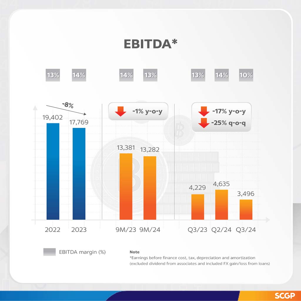 SCGP has focused on the strategies to address these challenges by adjusting its product portfolio to increase consumer packaging proportion and by offering innovative packaging solutions to sustain profitability. This includes adjusting the export strategy of packaging paper from Indonesia to Vietnam, while the Chinese market is still recovering, and efficiently managing energy costs by leveraging of technology and Artificial Intelligence into production processes, and expanding these practices to other plants in ASEAN countries. Additionally, SCGP is increasing of alternative fuels usage. As a result, in the first nine months of 2024, SCGP reported revenue from sales of Baht 101,553 million, an increase of 4% compared to the same period of last year. This growth was driven by continuous expansion across all business units, increased exports, and a recovery the durable goods sector. EBITDA stood at Baht 13,282 million, a decrease of 1% compared to the same period of last year. Profit for the period was Baht 3,756 million, a decrease of 7% compared to the same period of last year.