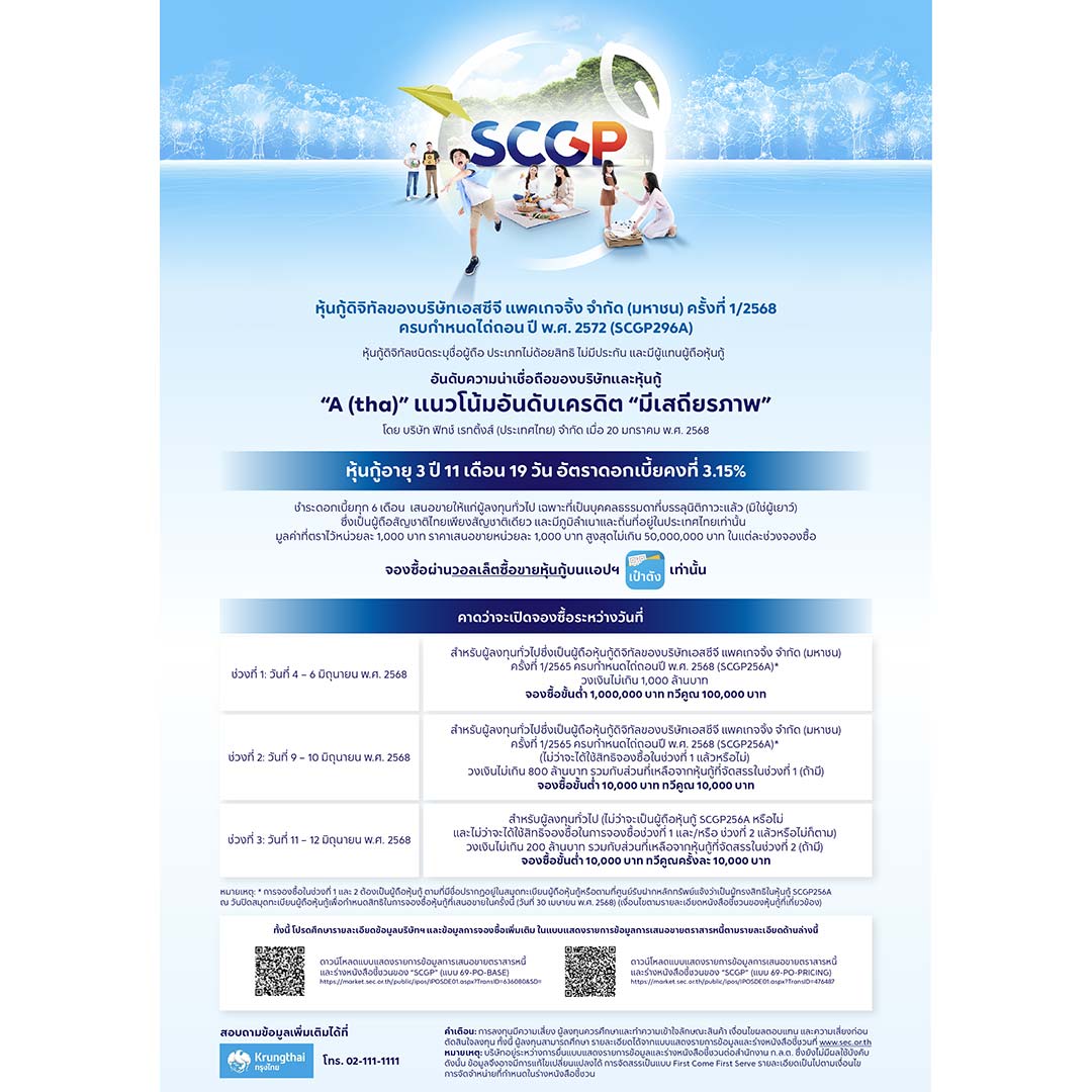 SCGP announces digital debenture interest rate of 3.15% per annum for a 3-year, 11-month, 19-day term. Interest payments will be made semi-annually. The debentures carry an “A” credit rating and will be offered through the Pao Tang application from June 4-12, 2025.