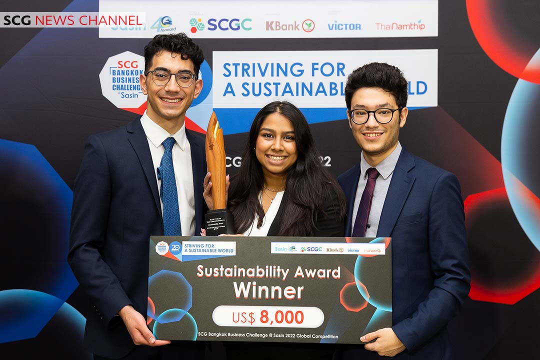 Bangkok, July 11, 2022 – Sasin School of Management and SCG Chemicals Public Company Limited or SCGC announced the winner of the SCG Bangkok Business Challenge @ Sasin 2022 – Global Competition, the longest-running student startup international competition under the theme, “Striving for a Sustainable World.” Team “EarthEn” from Arizona State University, USA, was the winner of the Global Competition and received H.M. The King Award Royal Trophy with a cash prize of US$ 18,000. Team “Neocycle” from the University of Calgary, Canada, was the winner of the Sustainability Award and received H.R.H. Princess Maha Chakri Sirindhorn Sustainability Award Royal Trophy with a cash prize of US$ 8,000. The startup teams were selected from 124 applicants from 19 countries from 55 educational institutions this year. The final round was held at Sasin School of Management on July 10.