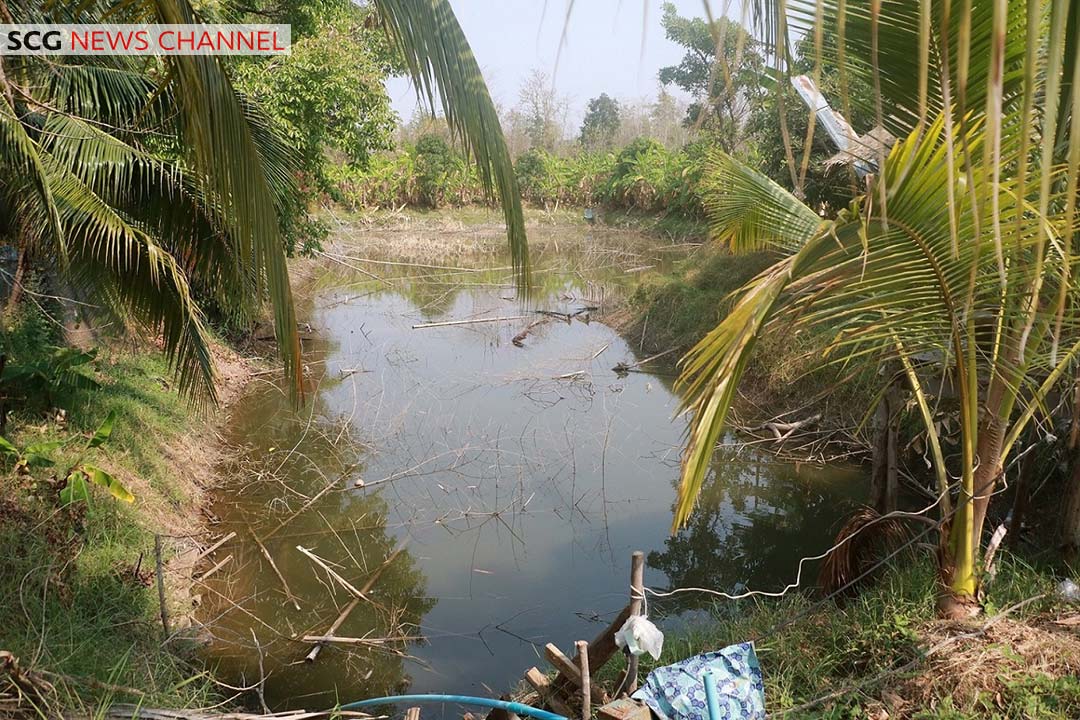 สระน้ำที่ขุดไว้ในพื้นที่บ้าน รองรับน้ำฝน เเม้มีน้ำใช้เเม้ในยามเเล้ง