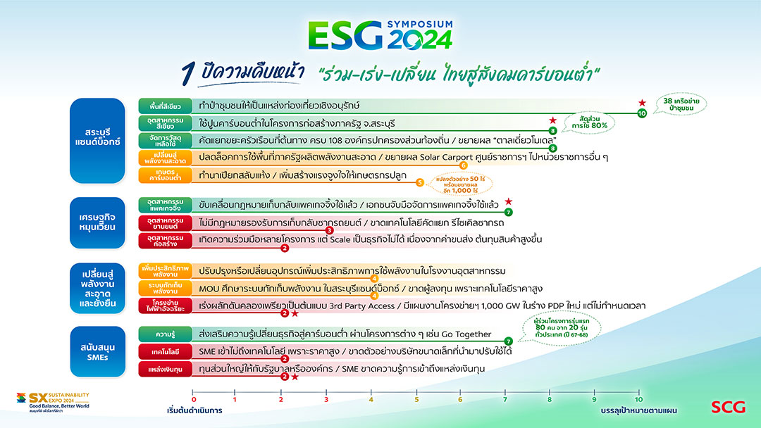 ครบ 1 ปีทุกภาคส่วน รัฐ-เอกชน-ประชาสังคม รวมพลัง “ร่วม-เร่ง-เปลี่ยน ไทยสู่สังคมคาร์บอนต่ำ” เกิดความคืบหน้าชัด ทุกฝ่ายขานรับ ปรับวิธีคิด “ทำงานแบบบูรณาการ” ยึดเป้าหมายเดียวกัน สื่อสารตรงไปตรงมา และลุยหน้างานจริง ช่วยปลดล็อค เพิ่มประสิทธิภาพการทำงาน เห็นผลเป็นรูปธรรม ตาม 4 ข้อเสนอจากงาน ESG Symposium 2023 ทั้งสร้าง “สระบุรีแซนด์บ็อกซ์” เมืองต้นแบบคาร์บอนต่ำแห่งแรกของไทยให้เกิดขึ้นจริง ส่งเสริมการก่อสร้างสีเขียวด้วยปูนซีเมนต์คาร์บอนต่ำ เอกชนจับมือจัดการแพคเกจจิ้งใช้แล้วผ่านโครงการรีไซเคิลแบบ Closed-Loop สนับสนุน SMEs เพิ่มโอกาสเข้าถึงความรู้เปลี่ยนธุรกิจสู่คาร์บอนต่ำ ผ่านโครงการ Go Together ปีนี้ทุกภาคส่วนกว่า 3,500 คนรวมพลัง เร่งเปลี่ยนประเทศ สู่สังคมคาร์บอนต่ำต่อเนื่องใน ESG Symposium 2024 วันที่ 30 กันยายนนี้ ที่ศูนย์การประชุมแห่งชาติสิริกิติ์