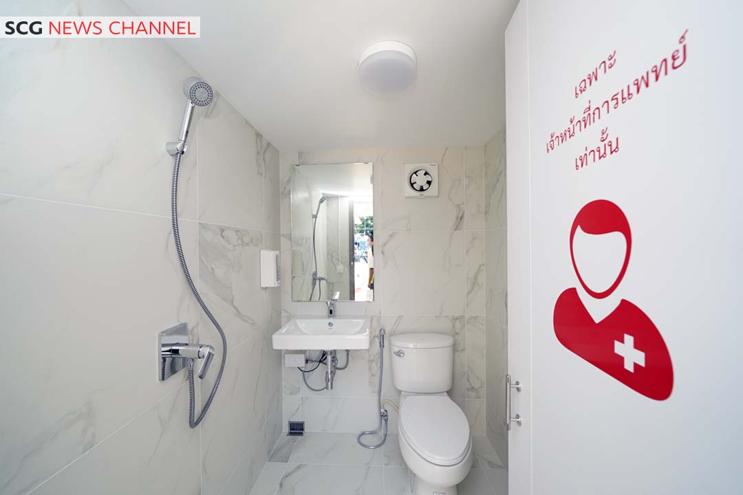 • ใช้งานให้เบ็ดเสร็จภายในห้องเดียว ออกแบบให้มีทั้งอ่างล้างมือและสุขภัณฑ์อยู่ภายในห้องเดียว เพื่อป้องกันการแพร่กระจายของเชื้อโรคระหว่างผู้ใช้งานแต่ละห้อง และติดตั้งฝักบัวเพิ่มเติม สำหรับห้องน้ำของบุคลากรการแพทย์