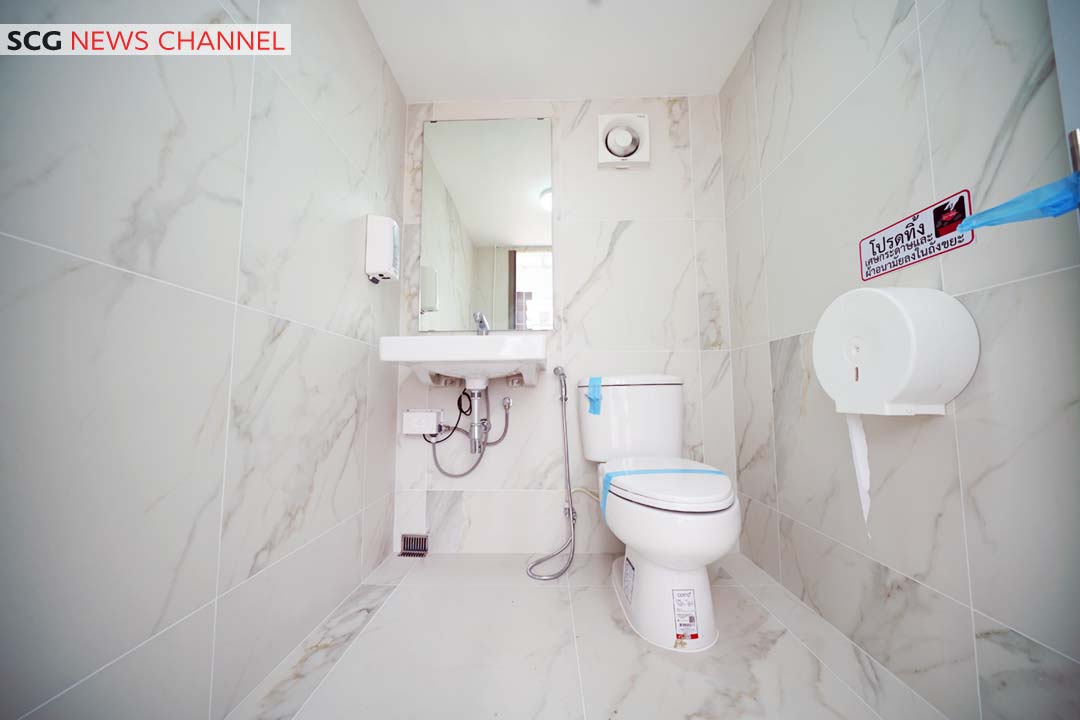 ห้องน้ำสำเร็จรูป (Modular Bathroom) เป็นอีกหนึ่งความใส่ใจที่มูลนิธิเอสซีจีส่งมอบให้บุคลากรการแพทย์ในโรงพยาบาล  โดยได้ติดตั้งแห่งแรกที่โรงพยาบาลราชวิถี  ออกแบบให้ใช้งานได้อย่างปลอดภัย ช่วยลดความเสี่ยงติดเชื้อ COVID-19  เอสซีจีนำความเชี่ยวชาญจากการผลิตห้องน้ำสำเร็จรูปมาพัฒนา โดยเน้นการผลิตแบบเบ็ดเสร็จพร้อมใช้งานจากโรงงานเพื่อควบคุมคุณภาพได้ดียิ่งขึ้น ช่วยเพิ่มประสิทธิผลในการก่อสร้าง ลดการทำงานหน้างานให้เหลือเพียงการเชื่อมต่อเข้ากับระบบส่วนกลางด้วยระบบ Plug & Play