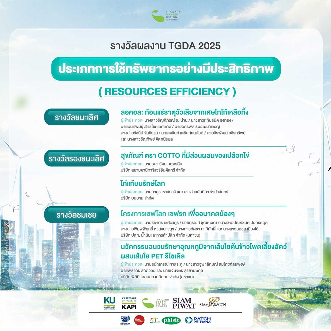 พิธีมอบรางวัล Thailand Green Design Awards 2025 สถาบันค้นคว้าและพัฒนาผลิตผลทางการเกษตร และอุตสาหกรรมเกษตร มหาวิทยาลัยเกษตรศาสตร์ จัดประกวดผลิตภัณฑ์ที่เป็นมิตรต่อสิ่งแวดล้อม Thailand Green Design Awards 2025 ในงานเกษตรแฟร์ ประจำปี 2568 โดยมุ่งเน้นความคิดสร้างสรรค์ในการผลิตผลิตภัณฑ์อย่างเป็นระบบ เน้นนวัตกรรมที่เป็นมิตรต่อสิ่งแวดล้อม ให้ความสำคัญกับปัญหาขยะ ที่ทวีความรุนแรงเพิ่มมากขึ้น รวมไปถึงการออกแบบและพัฒนาผลงาน ที่ยกระดับคุณภาพการใช้ชีวิตภายใต้สภาวการณ์ปัจจุบัน การส่งเสริมการใช้ประโยชน์ทรัพยากรชีวภาพ และการสร้างสังคมที่ยั่งยืนด้วยการมีส่วนร่วมในทุกภาคส่วน และปลูกจิตสำนึกด้านสิ่งแวดล้อม และร่วมสร้างสรรค์ผลิตภัณฑ์จากวัสดุธรรมชาติ และมีกระบวนการผลิตที่เป็นมิตรต่อสิ่งแวดล้อม ทั้งในเรื่องการเผยแพร่เอกลักษณ์ด้านสิ่งแวดล้อมและเป็นมหาวิทยาลัยสีเขียว (KU Green Campus) ซึ่งแบ่งออกเป็น การมอบรางวัลผลงานประเภทประหยัดพลังงาน (Energy Saving) รางวัลผลงานประเภทการใช้ทรัพยากรอย่างมีประสิทธิภาพ (Resource Efficiency) รางวัลผลงานประเภทที่ช่วยยกระดับคุณภาพการใช้ชีวิต (Life Enhancement) รางวัล TGDA Student Design Awards 2025 รางวัล ODS (Object of Desire Store) และรางวัลเกียรติยศ Honorary Awards