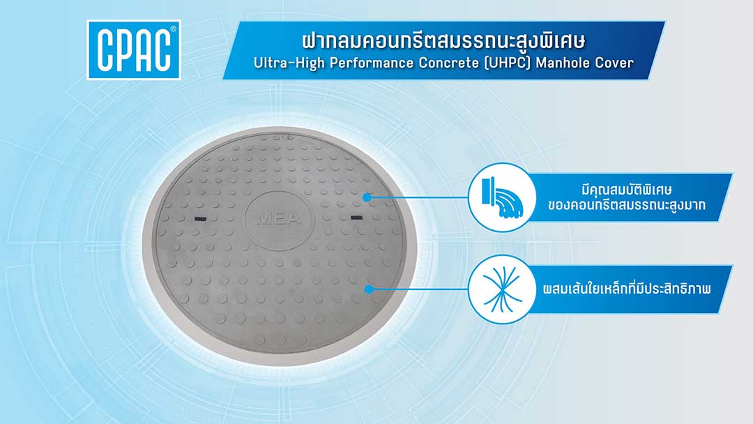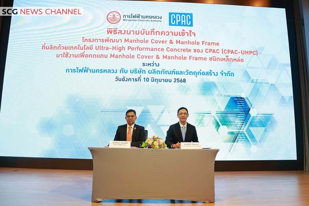 บริษัท ผลิตภัณฑ์และวัตถุก่อสร้าง จำกัด หรือ CPAC ในเครือเอสซีจี นำโดย คุณสุรชัย นิ่มละออ กรรมการผู้จัดการใหญ่ ธุรกิจเอสซีจี ซีเมนต์แอนด์กรีนโซลูชัน ในเอสซีจี ร่วมด้วย คุณวิลาศ เฉลยสัตย์ ผู้ว่าการการไฟฟ้านครหลวง ลงนามบันทึกข้อตกลง (MOU) ความร่วมมือด้านศึกษาและพัฒนาฝาท่อปิด ระบบท่อร้อยสายไฟฟ้าในผิวจราจร (Manhole Cover & Manhole Frame) ด้วยการนำเทคโนโลยีคอนกรีต สมรรถนะสูงพิเศษ (Ultra-High Performance Concrete) มาทดแทนระบบฝาท่อเหล็กหล่อแบบเดิม ด้วยคุณสมบัติพิเศษ คอนกรีตสูตรพิเศษเฉพาะ ผสมเส้นใยเหล็กคุณภาพสูง ที่มีความแข็งแรง ทนทาน รับน้ำหนักแรงกดได้ถึง 40 ตัน จากการทดสอบการรับแรงกด ของฝาบ่อตามมาตรฐาน EN 124 น้ำหนักเบากว่าฝาเหล็กหล่อแบบเดิม 30% อีกทั้งสามารถติดตั้งได้ง่าย สะดวกด้วยอุปกรณ์ทุ่นแรงเฉพาะ ที่ปลอดภัยต่อคนงาน และยังสามารถลดการปล่อยก๊าซคาร์บอนไดออกไซด์ จากกระบวนการผลิต ได้มากกว่าฝาท่อเหล็กหล่อแบบเดิมถึง 300 กิโลกรัม ต่อ 1 ฝา ลดปัญหาฝาท่อเหล็กถูกขโมย มีเสียงดังเมื่อรถยนต์วิ่งผ่าน ลดอุบัติเหตุบนการจราจรจากฝาเหล็กชำรุด