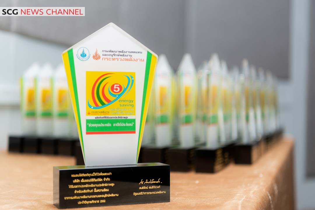 เอสซีจี โดย นายธนวัทฒ์ เกิดประเสริฐ (ซ้าย) ผู้จัดการอะคูสติกส์เอ็กซเพิร์ทแอนด์โซลูชัน บริษัท สยามไฟเบอร์กลาส จำกัด ในธุรกิจซีเมนต์และผลิตภัณฑ์ก่อสร้าง รับรางวัล “ฉลากประหยัดพลังงานประสิทธิภาพสูง หรือฉลากประหยัดพลังงานเบอร์ 5” จากกรมพัฒนาพลังงานทดแทนและอนุรักษ์พลังงาน กระทรวงพลังงาน โดย นายสนธิรัตน์ สนธิจิรวงศ์ (ขวา) รัฐมนตรีว่าการกระทรวงพลังงาน โดยมีสินค้าที่ได้รับรางวัล ได้แก่ ฉนวนกันความร้อน เอสซีจี ซึ่งเป็นฉนวนกันความร้อนรายแรกที่ได้รับฉลากดังกล่าวต่อเนื่อง 9 ปี ตั้งแต่ปี 2554-2563 โดยฉนวนกันความร้อน เอสซีจี สามารถช่วยลดความร้อนภายในบ้านได้ 3-5 องศาเซลเซียส และช่วยประหยัดค่าไฟจากเครื่องปรับอากาศได้ถึงร้อยละ 47