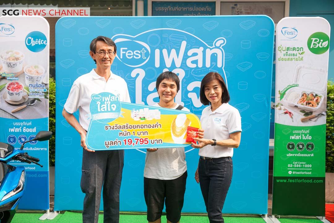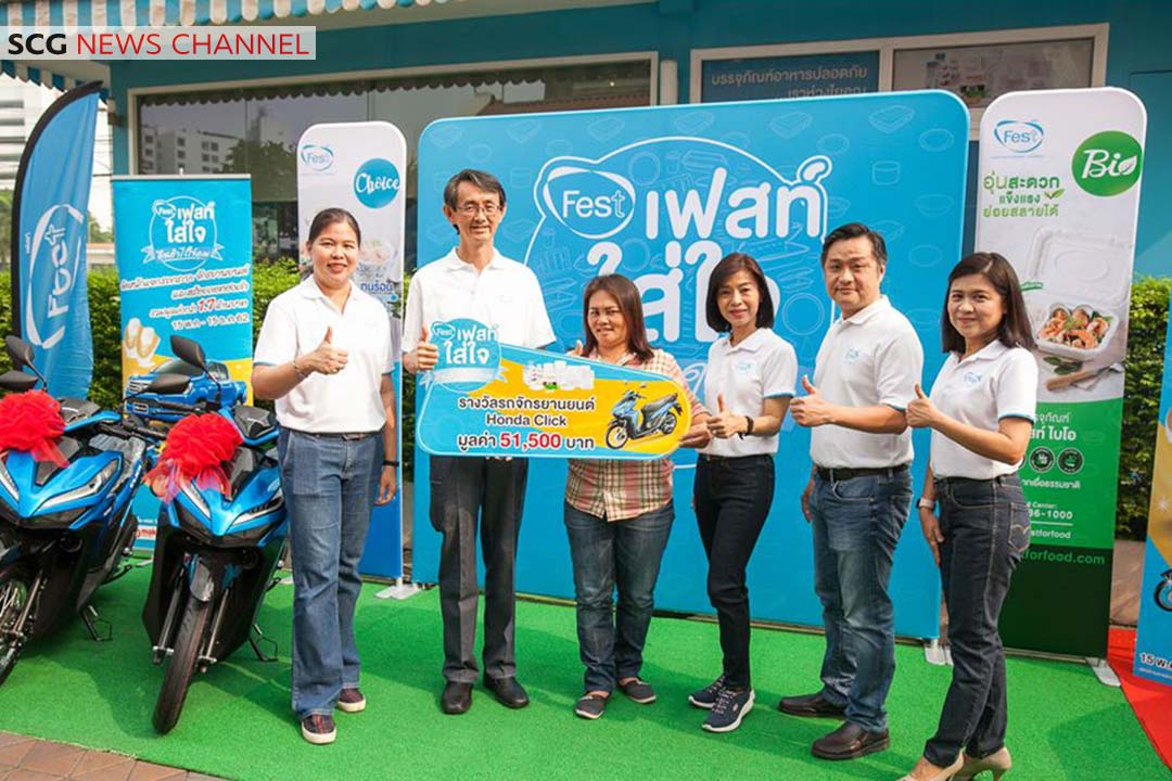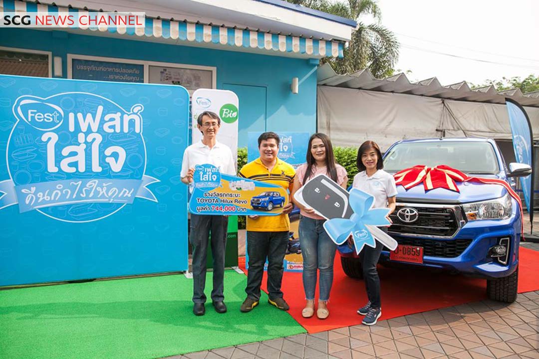 บรรจุภัณฑ์อาหารปลอดภัยเฟสท์ โดย นายวิชาญ เจริญกิจสุพัฒน์ กรรมการผู้จัดการ บริษัทผลิตภัณฑ์กระดาษไทย จำกัด ในธุรกิจแพคเกจจิ้ง เอสซีจี ผู้ผลิตและจัดจำหน่ายบรรจุภัณฑ์อาหารปลอดภัยเฟสท์ พร้อมคณะผู้บริหาร ร่วมมอบรางวัลรถกระบะ Toyota Hilux Revo Prerunner 2×4 2.4E AT ให้กับนายนพพล โรมแพน และผู้โชคดีที่ได้รับรางวัลอื่นๆ ในแคมเปญ “เฟสท์ใส่ใจ คืนกำไรให้คุณ ปี 2” รวมมูลค่ากว่า 1.8 ล้านบาท เพื่อตอบแทนลูกค้าที่เลือกใช้บรรจุภัณฑ์อาหารปลอดภัยเฟสท์ และกรอกรหัสจากคูปองที่อยู่ในแพ็คบรรจุภัณฑ์เฟสท์ ช้อยส์ และบรรจุภัณฑ์เฟสท์ ไบโอ มาร่วมลุ้นรางวัลทางLine @festforfood ระหว่างวันที่ 15 พ.ค. – 15 ธ.ค. 2562 ประกอบด้วยรางวัลใหญ่ รถกระบะ Toyota Hilux Revo Prerunner 2×4 2.4E AT จำนวน 1 คัน รถจักรยานยนต์ Honda Click 125i จำนวน 10 คัน สร้อยคอทองคำหนัก 1 สลึง จำนวน 60 รางวัล และทองคำหนัก 1 บาท จำนวน 10 รางวัล โดยพิธีมอบรางวัลจัดขึ้นเมื่อเร็ว ๆ นี้ ณ เฟสท์ ช็อป เอสซีจี สำนักงานใหญ่บางซื่อ