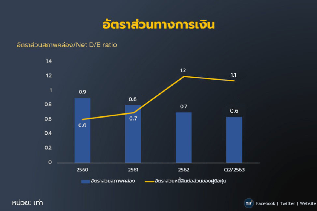 ด้านอัตราส่วนทางการเงิน ในปี 2562 SCGP มีอัตราส่วนสภาพคล่อง 0.7 เท่า และอัตราส่วนหนี้สินต่อส่วนของผู้ถือหุ้น 1.2 เท่า ทั้งนี้ อัตราส่วนหนี้สินที่มีภาระดอกเบี้ยต่อส่วนของผู้ถือหุ้นในปี 2562 อยู่ที่ 0.9 เท่า สำหรับไตรมาส 2 ของปีนี้ อัตราส่วนสภาพคล่องของ SCGP อยู่ที่ 0.6 เท่า อัตราส่วนหนี้สินสุทธิต่อส่วนของผู้ถือหุ้น 1.1 เท่า และอัตราส่วนหนี้สินที่มีภาระดอกเบี้ยสุทธิต่อส่วนของผู้ถือหุ้น อยู่ที่ 0.8 เท่า