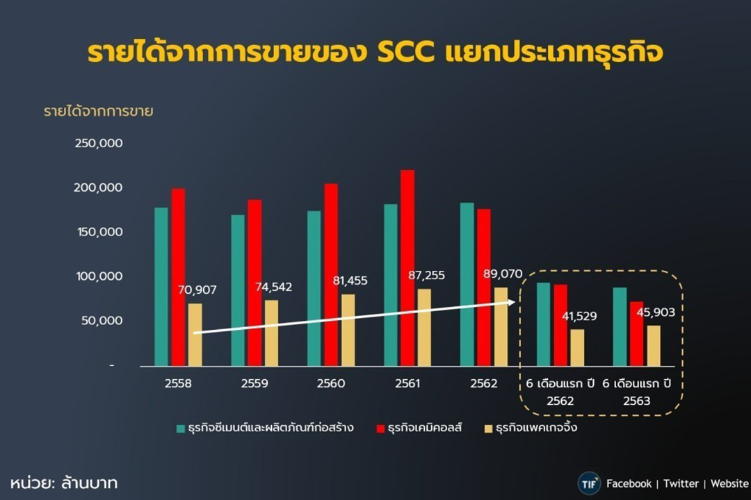 ธุรกิจแพคเกจจิ้ง ซึ่งดำเนินงานโดยบริษัทเอสซีจี แพคเกจจิ้ง จำกัด (มหาชน) (“SCGP”) มีสัดส่วนรายได้คิดเป็นร้อยละ 23 ของ SCC โดยเมื่อดูแนวโน้มการเติบโตของแต่ละกลุ่มธุรกิจ ตั้งแต่ปี 2557 ถึง 2562 จะเห็นว่ากลุ่มธุรกิจแพคเกจจิ้งมีแนวโน้มการเติบโตของธุรกิจและรายได้ที่น่าสนใจ โดยที่ SCGP กำลังจะจดทะเบียนเข้าตลาดหลักทรัพย์แห่งประเทศไทย เพื่อระดมทุนมาใช้ในการขยายกำลังการผลิต และเสริมสร้างศักยภาพในการดำเนินธุรกิจ มุ่งสู่การเป็นผู้ผลิตบรรจุภัณฑ์ชั้นนำของภูมิภาคอาเซียน