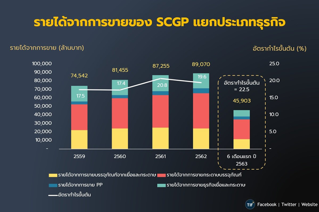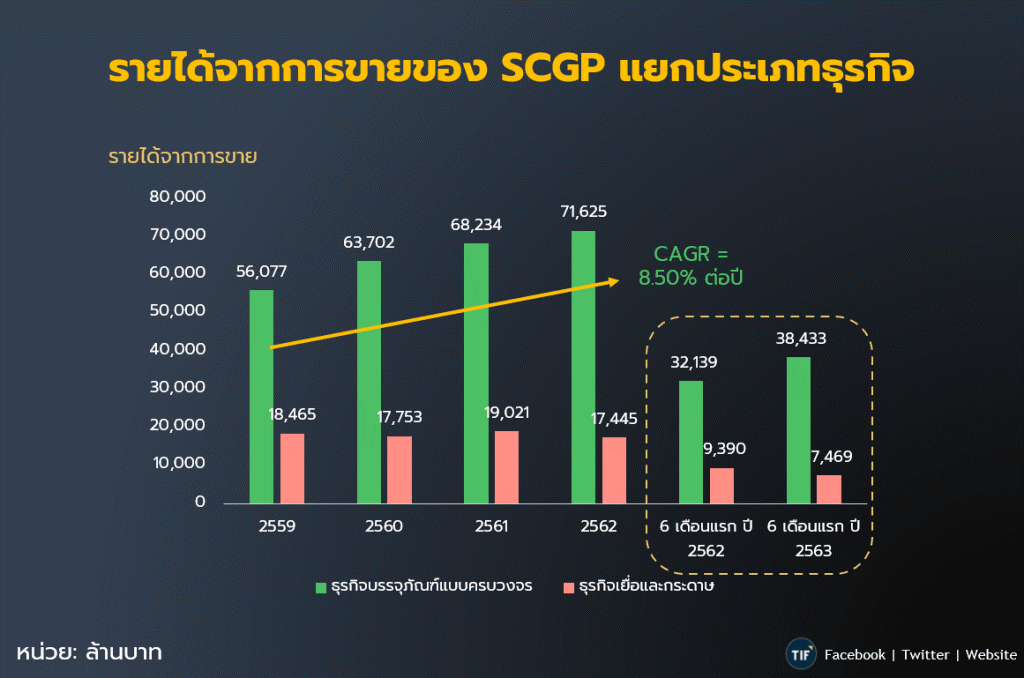 โดยรายได้จากการขายส่วนใหญ่จะมาจากธุรกิจบรรจุภัณฑ์ เฉลี่ยประมาณร้อยละ 84 จากสัดส่วนรายได้จากการขายทั้งหมด ส่วนอีกประมาณร้อยละ 16 ที่เหลือจะเป็นรายได้ที่มาจากธุรกิจเยื่อและกระดาษ และหากนับตั้งแต่ปี 2559 ถึง 2562 รายได้จากการขายของ SCGP นั้นก็เติบโตขึ้นเรื่อย ๆ ทุกปี จากการที่รายได้จากการขายในธุรกิจบรรจุภัณฑ์แบบครบวงจรเติบโตอย่างต่อเนื่อง ซึ่งหากคิดเป็นอัตราการเติบโตเฉลี่ยต่อปี (Compound Annual Growth Rate) จะเท่ากับ 8.50% ต่อปี โดยในครึ่งปีแรกของปี 2563 รายได้เติบโตร้อยละ 20 เมื่อเทียบกับช่วงเดียวกันในปีที่ผ่านมา