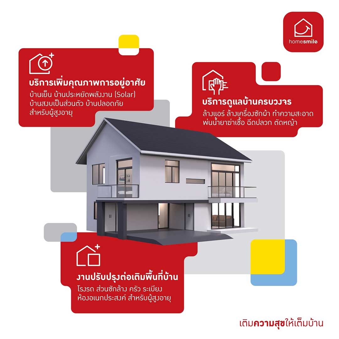 ปัจจุบัน HomeSmile (โฮมสมายล์) มีบริการครอบคลุมการดูแลบ้านตั้งแต่ 1) งานปรับปรุงต่อเติมพื้นที่บ้าน ในส่วนของ โรงรถ ส่วนซักล้าง ครัว ระเบียง ห้องอเนกประสงค์ สำหรับผู้สูงอายุ หรือห้องสำหรับทำงาน รวมถึงงานหลังคา งานซ่อมแซมอื่นๆ 2) บริการเพิ่มคุณภาพการอยู่อาศัย เช่น บ้านเย็น บ้านประหยัดพลังงาน บ้านสงบเป็นส่วนตัว บ้านปลอดภัยสำหรับผู้สูงอายุ เป็นต้น 3) บริการดูแลบ้านครบวงจร ให้บริการโดย คิวช่าง ได้แก่ ล้างแอร์ ล้างเครื่องซักผ้า ทำความสะอาด พ่นน้ำยาฆ่าเชื้อ ฉีดปลวก และตัดหญ้า อีกด้วย นับว่าเป็นแบรนด์ผู้ให้บริการ Home Improvement ที่มีบริการครบในที่เดียว เหมาะกับไลฟ์สไตล์เจ้าของบ้านยุคใหม่ที่ต้องการความง่าย สะดวก ได้คุณภาพที่มีมาตรฐาน
