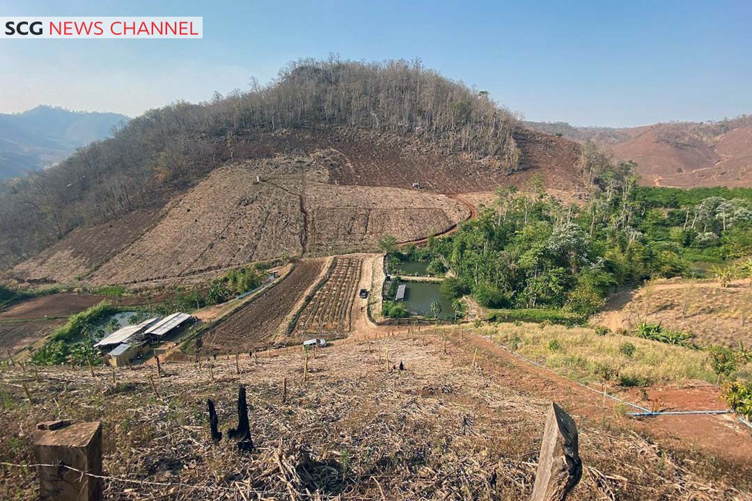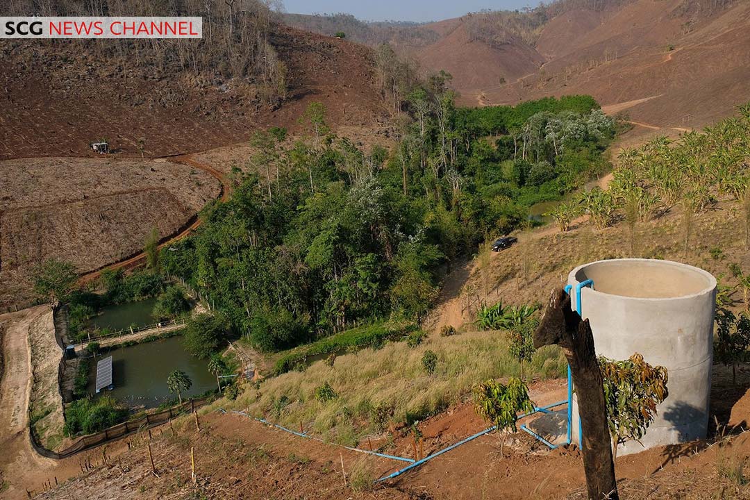 จากมุมสูง พอให้เห็นภาพได้ว่า สภาพเขาหัวโล้นยังหลงเหลืออยู่บางส่วน เนินเขาส่วนหนึ่งถูกปรับสภาพดินไว้รอพืชลงปลูก สีน้ำตาลจากซากต้นไม้ที่แห้งแล้งเพราะแดดเผาบริเวณพื้นที่ลุ่ม เปลี่ยนเป็นสีเขียวชะอุ่ม สะท้อนความชุ่มชื้นได้อย่างสดชื่น และมีบ่อน้ำที่มีน้ำกักเก็บไว้อย่างสมบูรณ์ถึง 2 บ่อ