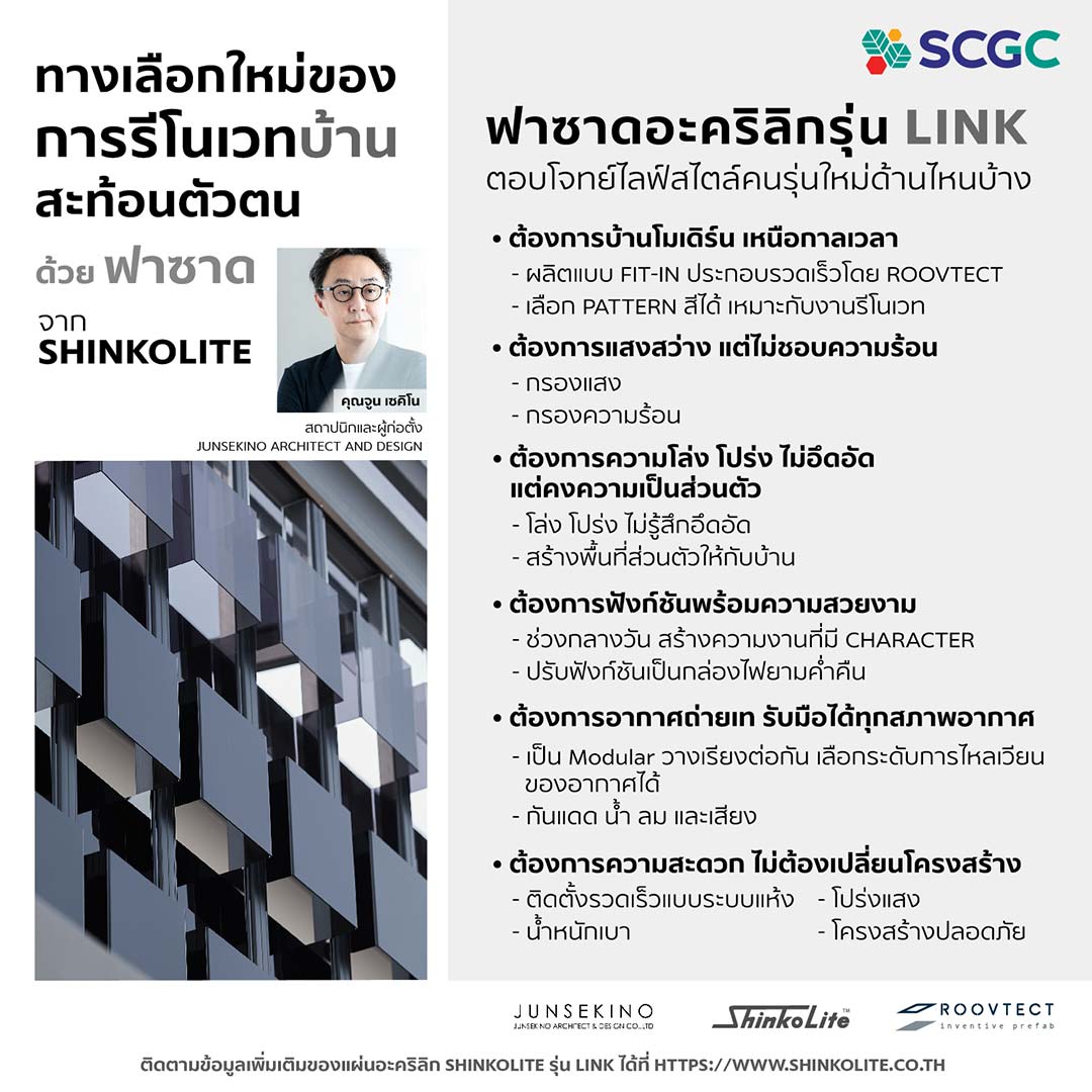 ไลฟ์สไตล์ของผู้อยู่อาศัยในปัจจุบันต้องการสะท้อนตัวตน ทั้งยังต้องตอบโจทย์เรื่องความงาม และฟังก์ชันการใช้งานไปพร้อมกัน จึงเป็นความท้าทายของสถาปนิกที่ต้อง “เชื่อม” ความต้องการสุดท้าทายเหล่านี้ให้ลงตัว เปลี่ยนโซลูชันที่ซับซ้อนให้กลายเป็นเรื่องง่าย ด้วย “Façade (ฟาซาด) อะคริลิก รุ่น LINK ภายใต้แบรนด์ SHINKOLITE (ชินโคไลท์)” ผู้นำเรื่องนวัตกรรมการผลิตแผ่นอะคริลิก ที่ทนทุกสภาพอากาศ ในกลุ่มธุรกิจเอสซีจี เคมิคอลส์ หรือ SCGC ผ่านการออกแบบโดยคุณจูน เซคิโน สถาปนิกเชื้อสายญี่ปุ่น ผู้ก่อตั้ง จูน เซคิโน อาร์คิเทคต์ แอนด์ ดีไซน์ (Junsekino Architect and Design) ซึ่งมีผลงานการออกแบบที่มีเอกลักษณ์ โดดเด่น แตกต่าง ทว่าเรียบง่าย และเชี่ยวชาญในการเลือกใช้วัสดุที่ตอบโจทย์สภาพแวดล้อม เหมาะกับการรีโนเวทบ้าน หรือการสร้างบ้านใหม่ ตอบไลฟ์สไตล์ของคนยุคนี้ ที่ต้องการให้อาคารสื่อสารและสะท้อนตัวตน ของผู้อยู่อาศัยได้ดียิ่งขึ้น