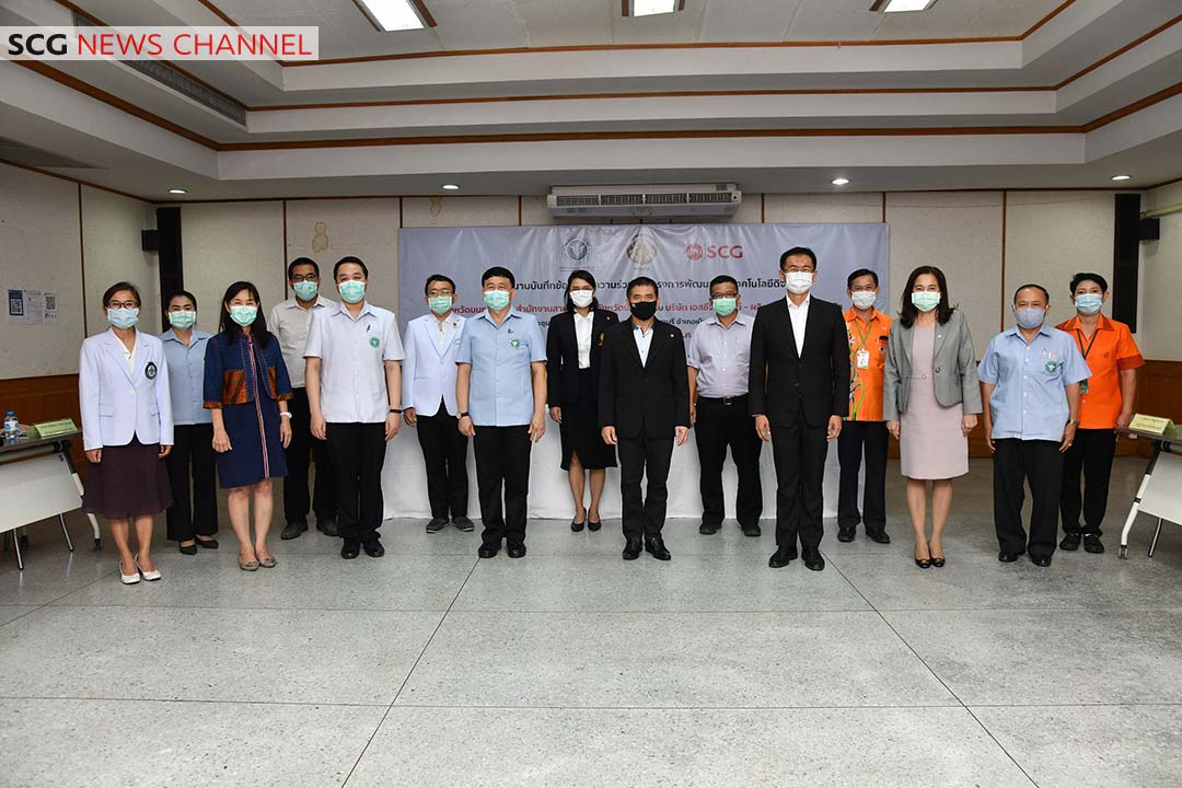 นายสุจินต์ ไชยชุมศักดิ์ ผู้ว่าราชการจังหวัดนนทบุรี พร้อมด้วย นายแพทย์พนัส โสภณพงษ์ นายแพทย์สาธารณสุขจังหวัดนนทบุรี และนายวชิระชัย คูนำวัฒนา Head of Living Solution Business ในธุรกิจซีเมนต์และผลิตภัณฑ์ก่อสร้าง เอสซีจี ร่วมลงนามบันทึกข้อตกลงความร่วมมือ “โครงการพัฒนาด้านเทคโนโลยีดิจิทัล” ระหว่างจังหวัดนนทบุรี สำนักงานสาธารณสุขจังหวัดนนทบุรี และเอสซีจี ด้วยการนำโมบายแอปพลิเคชัน ที่เป็นแพลตฟอร์มสำหรับคัดกรองและดูแลรักษาคนไข้โควิด-19 ผ่านทางออนไลน์ มาใช้กับเครือข่ายโรงพยาบาลในจังหวัด เพื่อช่วยลดความเสี่ยงการติดเชื้อโควิด-19 ของผู้เข้ารับการตรวจและบุคลากรทางการแพทย์ระหว่างขั้นตอนการวินิจฉัยและรักษาโรคโดยไม่จำเป็น อีกทั้งช่วยให้ประชาชนเข้าถึงบริการได้เร็วและทั่วถึงมากขึ้น รวมถึงช่วยบุคลากรทางการแพทย์ในการบริหารจัดการทรัพยากรที่มีจำกัดได้อย่างมีประสิทธิภาพยิ่งขึ้น ในการดูแลและติดตามอาการของคนไข้จนรักษาหายขาด