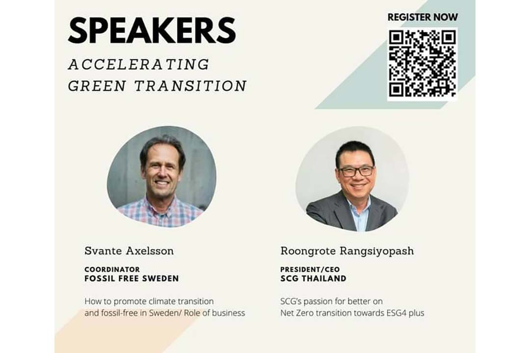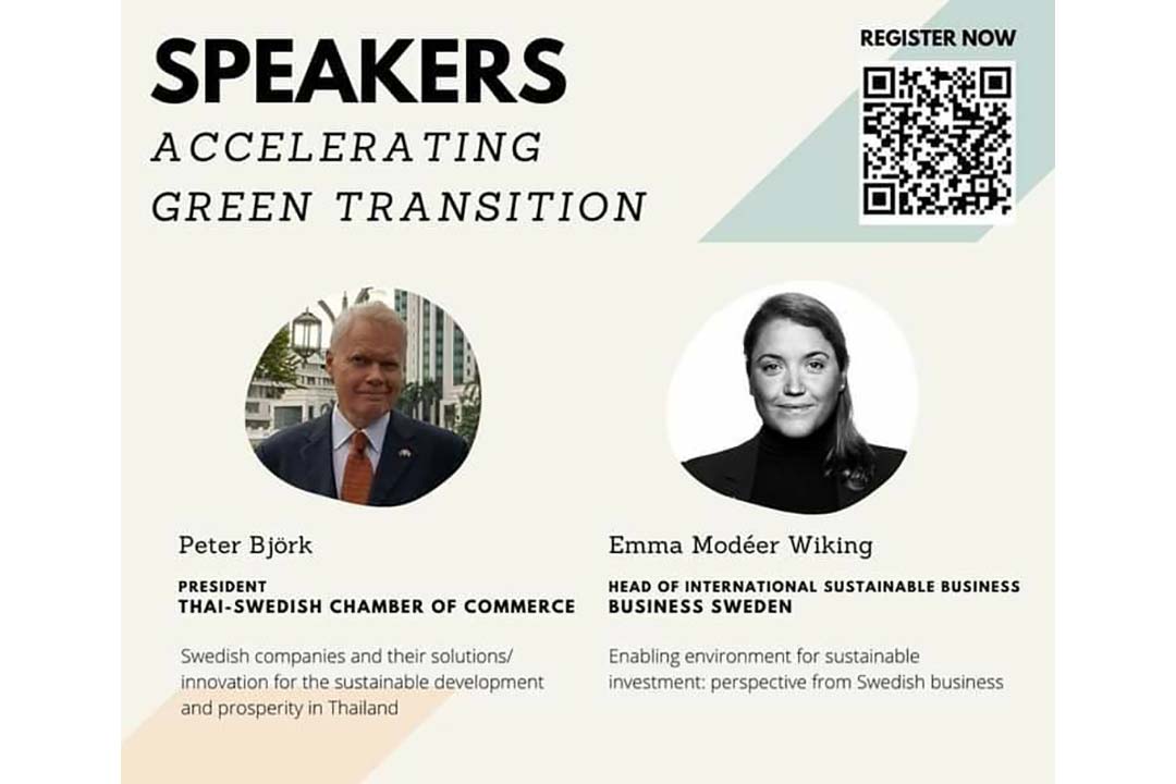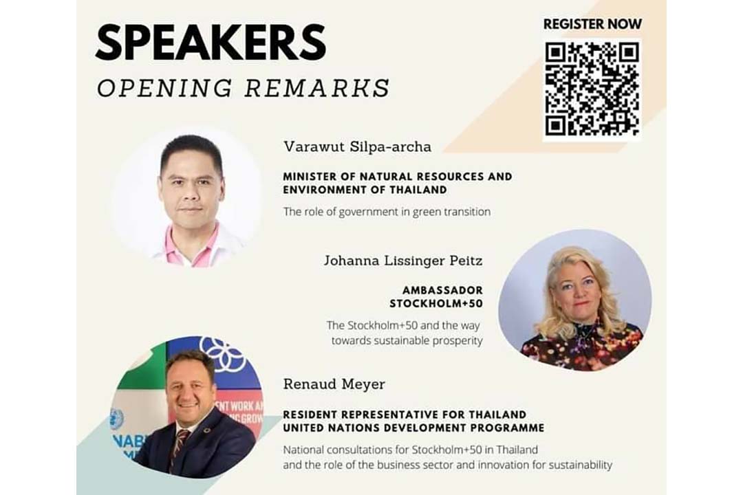 เพื่อสร้างความมีส่วนร่วมและความรับรู้ถึงบทบาทของภาคเอกชนและอุตสาหกรรมต่อประเด็นด้านสิ่งแวดล้อม และการนำนวัตกรรมมาใช้ในการสร้างสรรค์อนาคตที่ยั่งยืน สถานเอกอัครราชทูต ณ กรุงสตอกโฮล์ม ร่วมกับ Thailand and Nordic Counties Innovation Unit (TNIU) และ Business Sweden จึงได้ร่วมกันเป็นเจ้าภาพจัดงานสัมมนาออนไลน์ ในหัวข้อ A Healthy Planet for the Prosperity of All: Innovation for Sustainability ในวันที่ 1 มิถุนายน ระหว่าง 13.30 – 15.00 น. ตามเวลาสตอกโฮล์ม (18.30 – 20.00 น. กรุงเทพฯ) โดยได้เชิญผู้เชี่ยวชาญและผู้นำในแวดวงต่าง ๆ มาบอกเล่ามุมมองในหัวข้อต่าง ๆ รวมถึงตัวแทนเยาวชนของไทยและสวีเดนที่จะขึ้นพูดเพื่อสะท้อนมุมมองของเยาวชนด้านสิ่งแวดล้อม