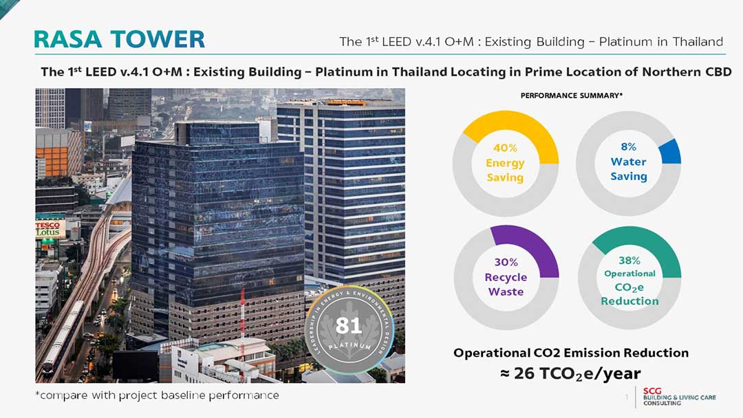 อาคารรสา ทาวเวอร์ เป็นอาคารสำนักงานขนาดใหญ่ มีพื้นที่ใช้สอยกว่า 76,000 ตารางเมตร ต้องการยกระดับมาตรฐานอาคาร ให้ดีขึ้นตามมาตรฐาน LEED ที่ได้รับการรับรองก่อนหน้านี้ สู่เวอร์ชันล่าสุด ที่มุ่งเน้นการวัดผลประสิทธิภาพ โดยรวมของอาคารมากขึ้น ลดการปล่อยก๊าซเรือนกระจกได้จริง ทั้งยังต้องส่งเสริมการดูแลสุขภาวะที่ดีให้แก่ผู้ใช้อาคารอย่างต่อเนื่อง เป็นการตอกย้ำภาพลักษณ์ของอาคารรสา ทาวเวอร์ ที่ให้ความสำคัญกับคุณภาพการใช้ชีวิตของผู้ใช้อาคาร และพัฒนาประสิทธิภาพของอาคารให้สูงขึ้น โดยบริษัท SCG Building and Living Care Consulting ในฐานะบริษัทที่ปรึกษาการออกแบบอาคารเพื่อความยั่งยืนและเพื่อสุขภาวะที่ดี ได้วิเคราะห์ข้อมูลด้านประสิทธิภาพ คำนวณความคุ้มค่าและผลตอบแทน เพื่อพัฒนาโซลูชันที่เหมาะสมที่สุดให้กับโครงการ ซึ่งอาคารรสา ทาวเวอร์ สามารถผ่านเกณฑ์ตัดสินจาก 5 จุดหลัก ประกอบด้วย
