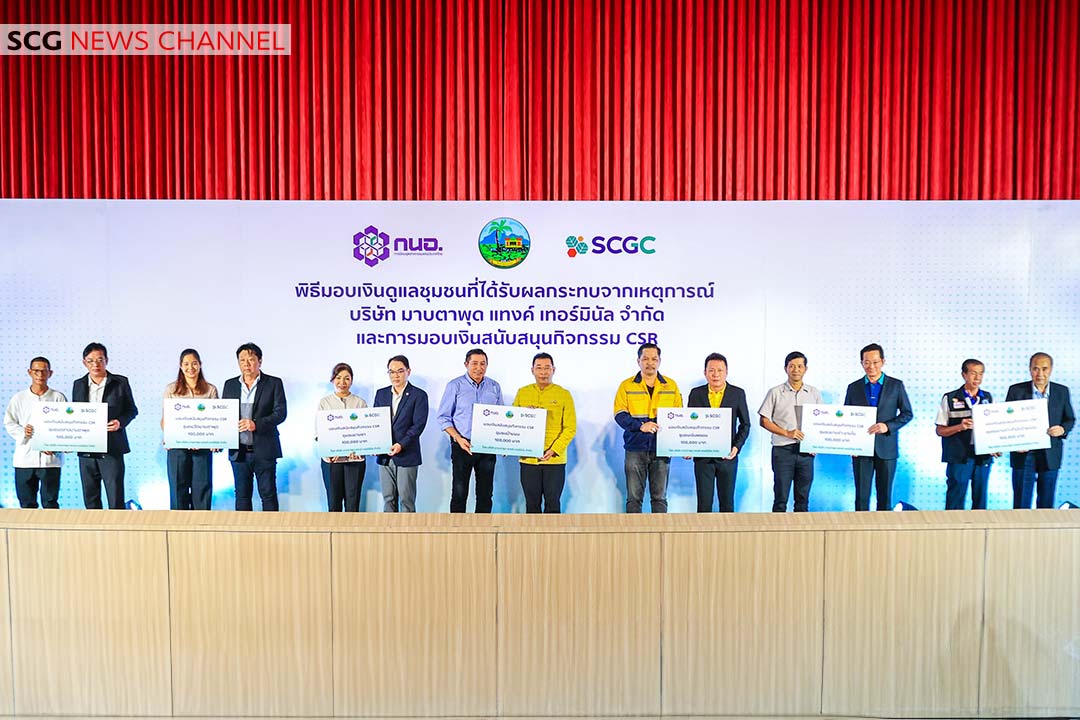 นายศักดิ์ชัย ปฏิภาณปรีชาวุฒิ ประธานเจ้าหน้าที่บริหารและกรรมการผู้จัดการใหญ่ บริษัท เอสซีจี เคมิคอลส์ จำกัด (มหาชน) หรือ SCGC กล่าวว่า “บริษัทฯ ขออภัยและรู้สึกเสียใจอย่างสุดซึ้ง กับเหตุการณ์ของบริษัท มาบตาพุด แทงค์ เทอร์มินัล จำกัด โดยบริษัทฯ ได้เร่งดำเนินการเพื่อมอบเงินดูแลชุมชนที่ได้รับผลกระทบ แบ่งกรอบการดูแลเป็น 3 กรอบ ได้แก่ 1) มอบเงินให้กับชุมชน ตามประกาศพื้นที่สาธารณภัย จำนวน 2 ชุมชน คือ ชุมชนตากวน อ่าวประดู่ และชุมชนหนองแฟบ โดยพิจารณาจากจำนวนประชากรตามทะเบียนราษฎร์ สำหรับชุมชนที่อาศัยอยู่ในห้องเช่าซึ่งไม่อยู่ในทะเบียนราษฎร์ บริษัทฯ จะช่วยเหลือด้วยการมอบถุงยังชีพต่อไป 2) ช่วยเหลือและชดใช้ค่าเสียหาย แก่ประชาชนที่ได้รับผลกระทบ ซึ่งจังหวัดระยองได้แต่งตั้งคณะกรรมการกำกับ ติดตามการช่วยเหลือและชดใช้ค่าเสียหาย โดยมีผู้ว่าราชการจังหวัดระยอง เป็นประธานกรรมการ และ 3) สนับสนุนกิจกรรม CSR โดยบริษัทฯ มีความตั้งใจที่จะมอบเงินส่วนนี้เป็นพิเศษ เพื่อให้ชุมชนได้นำไปทำกิจกรรมสาธารณประโยชน์เพื่อส่วนรวม โดยพิจารณามอบให้กับชุมชนในเขตเทศบาลเมืองมาบตาพุด เทศบาลตำบลมาบข่าพัฒนา และเทศบาลตำบลบ้านฉาง ซึ่งมีจำนวน 62 ชุมชน 21 กลุ่มประมง โดยบริษัทฯ สนับสนุนงบประมาณ CSR รวม 7,250,000 บาท ซึ่งการมอบเงิน เพื่อดูแลชุมชนในครั้งนี้ เป็นการมอบเงินในกรอบที่ 1 และ 3 สำหรับกรอบที่ 2 ขณะนี้อยู่ในความดูแลของคณะกรรมการฯ”
