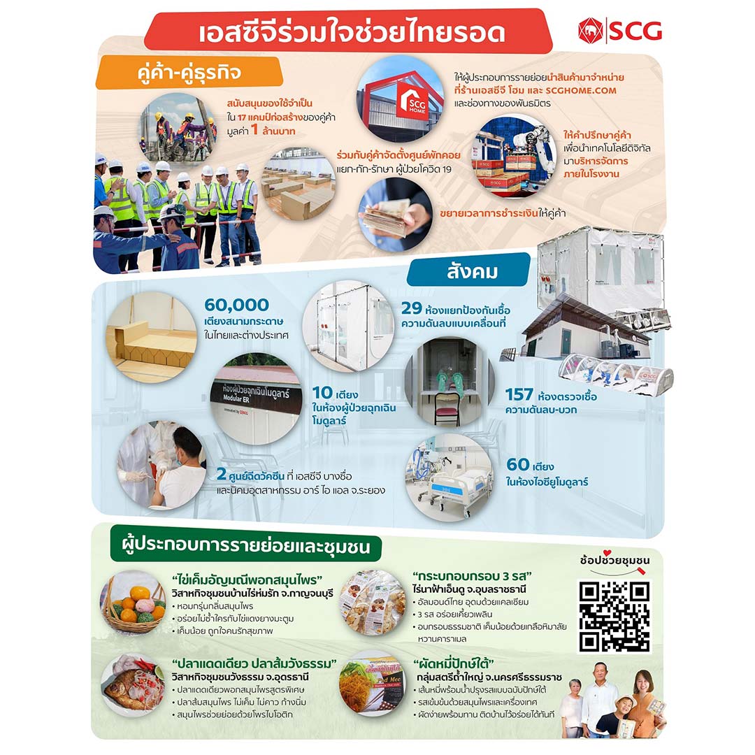ขณะเดียวกัน เอสซีจีมีความห่วงใยสถานการณ์ที่เกิดขึ้นเป็นอย่างยิ่ง จึงได้ใช้ประสบการณ์ ความรู้ ความเชี่ยวชาญช่วยเหลือสังคมมาอย่างต่อเนื่องในทุกด้าน ทั้งเร่งช่วยเหลือคู่ค้า-คู่ธุรกิจที่ได้รับผลกระทบทางเศรษฐกิจ ด้วยการขยายเวลาการชำระเงิน ให้คำปรึกษาเรื่องการนำเทคโนโลยีดิจิทัลมาบริหารจัดการภายในโรงงาน เพื่อให้ธุรกิจดำเนินงานได้อย่างต่อเนื่อง ร่วมกับคู่ค้าจัดตั้งศูนย์พักคอยสำหรับแยก-กัก-รักษาผู้ป่วยโควิด 19 สนับสนุนเครื่องใช้อุปโภคบริโภคสำหรับช่างภายในแคมป์ก่อสร้างของคู่ค้า รวมทั้งเปิดโอกาสให้ผู้ประกอบการรายย่อยนำสินค้ามาจำหน่ายที่ร้านเอสซีจี โฮม SCGHOME.com และช่องทางของพันธมิตร เพื่อเพิ่มโอกาสในการสร้างรายได้และช่วยให้รักษาธุรกิจให้คงอยู่ต่อไปได้
