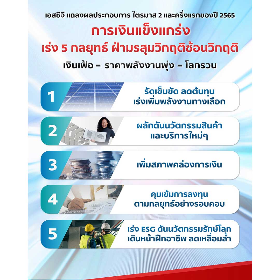 5.) เดินหน้า ESG ด้วยแนวทาง ESG 4 Plus (มุ่ง Net Zero – Go Green – Lean เหลื่อมล้ำ – ย้ำร่วมมือ ภายใต้ความเชื่อมั่น โปร่งใส) โดยในครึ่งปีแรกของปี 2565 มียอดขายนวัตกรรมรักษ์โลก ภายใต้ฉลาก SCG Green Choice เท่ากับ 153,240 ล้านบาท คิดเป็นร้อยละ 50 ของยอดขายรวม