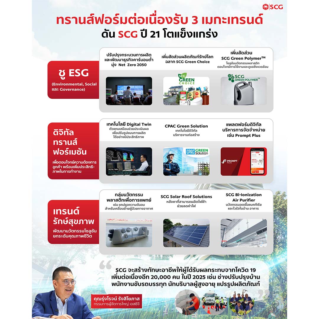 นายรุ่งโรจน์กล่าวว่า “แม้ว่าในปี 2564 เศรษฐกิจทั่วโลกได้รับผลกระทบจากต้นทุนพลังงาน วัตถุดิบสูง ภาวะเงินเฟ้อและโควิด 19 แต่เอสซีจีได้เร่งทรานส์ฟอร์มธุรกิจอย่างต่อเนื่อง จึงสามารถรักษาการเติบโตในปีที่ผ่านมาเป็นที่น่าพอใจ โดยปรับธุรกิจให้สอดคล้องกับ 3 เมกะเทรนด์ ได้แก่ ชู ESG ในการดำเนินธุรกิจ – ใช้ดิจิทัลทรานส์ฟอร์เมชัน ตอบโจทย์ความต้องการลูกค้า – พัฒนานวัตกรรมโซลูชันรับเทรนด์การรักษ์สุขภาพและยกระดับคุณภาพชีวิต