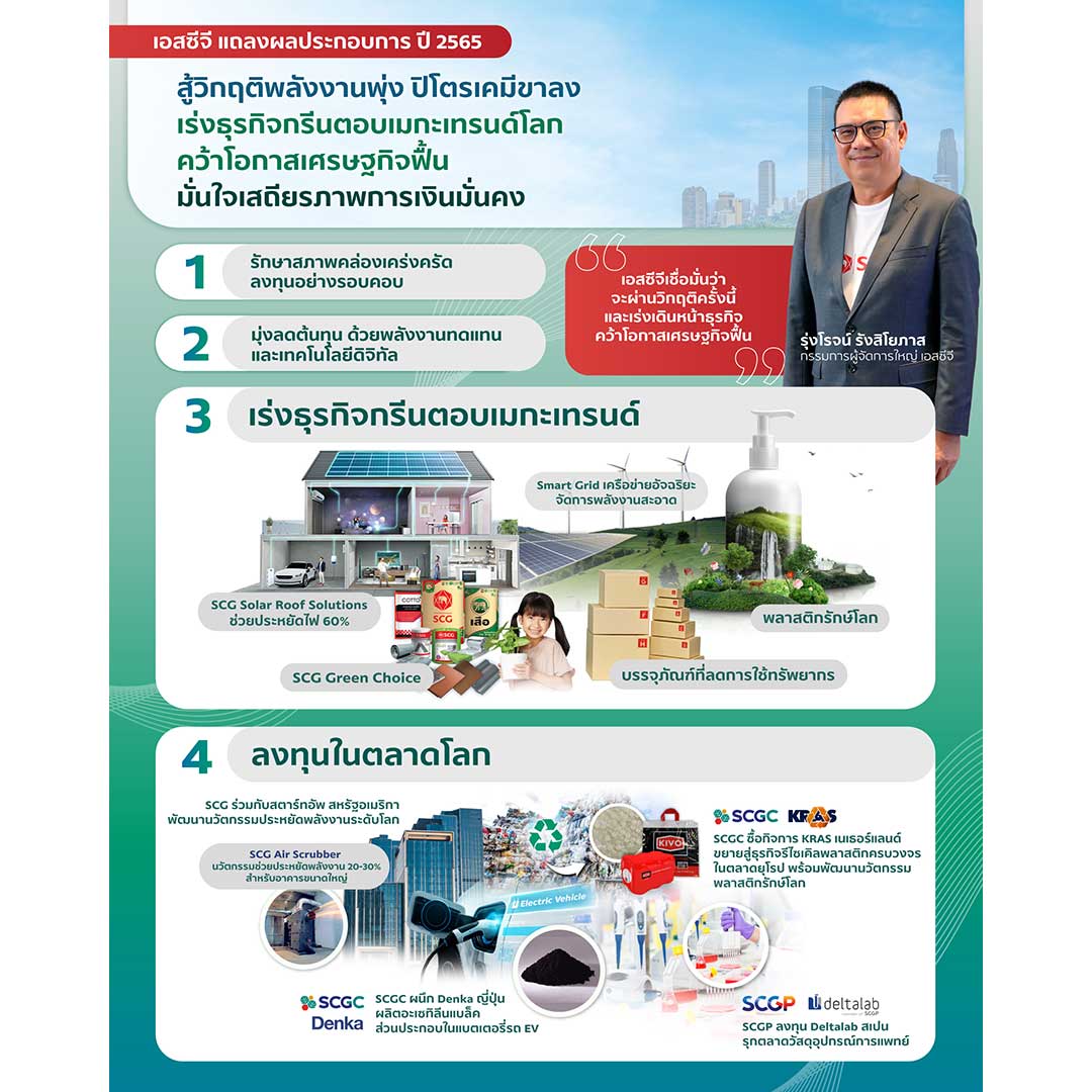 นายรุ่งโรจน์ รังสิโยภาส กรรมการผู้จัดการใหญ่ เอสซีจี กล่าวว่า “ผลประกอบการเอสซีจีปี 2565 มีรายได้ 569,609 ล้านบาท เพิ่มขึ้นร้อยละ 7 กำไร 21,382 ล้านบาท ลดลงร้อยละ 55 สาเหตุจากเศรษฐกิจชะลอตัว ปิโตรเคมีขาลง ต้นทุนพลังงานสูง ในขณะที่ ไตรมาส 4 ปี 2565 มีกำไร 157 ล้านบาท ทั้งนี้ หากไม่รวมการปรับมูลค่าสินค้าคงเหลือ รายการด้อยค่าสินทรัพย์ และรายการอื่น จะมีกำไร 1,070 ล้านบาท ลดลงร้อยละ 66 จากไตรมาสก่อน ทั้งหมดนี้ เป็นผลจากวิกฤติซ้อนวิกฤติ ความขัดแย้งรัสเซีย-ยูเครน ราคาพลังงานทั้งถ่านหินและค่าไฟพุ่งสูงขึ้นอย่างมาก เงินเฟ้อ ค่าเงินบาทผันผวน เศรษฐกิจจีนชะลอตัว และวัฏจักรปิโตรเคมีขาลงครั้งใหญ่ที่สุดในรอบ 20 ปี แต่เอสซีจีได้เกาะติดสถานการณ์อย่างใกล้ชิด และปรับตัวฉับไวเพื่อบรรเทาผลกระทบที่มีต่อธุรกิจโดยรวม โดยมุ่งเน้นรักษาเสถียรภาพทางการเงินให้มั่นคง ลดต้นทุนโดยใช้พลังงานทดแทน และเทคโนโลยีดิจิทัลในกระบวนการผลิต พิจารณาการลงทุนตามกลยุทธ์อย่างรอบคอบ ส่งผลให้เงินสดคงเหลือแข็งแกร่งอยู่ที่ 95,000 ล้านบาท ขณะเดียวกัน ความท้าทายที่ผ่านมาก็เอื้อให้เกิดโอกาสใหม่ ๆ ของธุรกิจ โดยเฉพาะความต้องการสินค้ากรีน ซึ่งเป็นทิศทางสำคัญของโลก และมีการขยายตัวต่อเนื่อง ทั้งกลุ่มพลังงานสะอาด พลาสติกรักษ์โลก โซลูชันประหยัดพลังงาน บรรจุภัณฑ์ที่ลดการใช้ทรัพยากร โดยในปี 2565 ยอดขาย SCG Green Choice เติบโตโดดเด่นร้อยละ 34 เกินเป้าหมายที่ตั้งไว้ หรือมียอดขายรวม ร้อยละ 51 ซึ่งทุกกลุ่มธุรกิจของเอสซีจีพร้อมเร่งเดินหน้าเต็มที่ เพื่อเสริมความแข็งแกร่งของธุรกิจให้มากยิ่งขึ้น