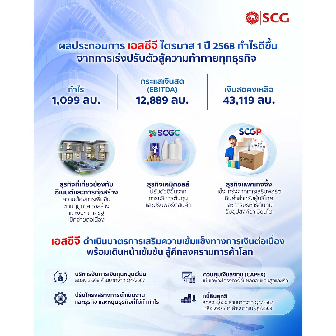 นายธรรมศักดิ์ เศรษฐอุดม กรรมการผู้จัดการใหญ่ เอสซีจี กล่าวว่า “ไตรมาส 1 ปี 2568 เอสซีจี มีกำไรสำหรับงวด 1,099 ล้านบาท เนื่องจากทุกธุรกิจปรับตัวดีขึ้น ตามมาตรการเสริมความเข้มแข็ง ทางการเงินที่ดำเนินการมาอย่างต่อเนื่อง เร่งยกระดับขีดความสามารถทางการแข่งขัน ด้วยการลดต้นทุนการผลิตและการบริหารจัดการ รวมทั้งการขยายตลาดใหม่ได้อย่างมีประสิทธิภาพ ประกอบกับธุรกิจที่เกี่ยวข้องกับ ซีเมนต์และการก่อสร้าง มีความต้องการเพิ่มขึ้นตามฤดูกาลก่อสร้าง และงบประมาณภาครัฐ ที่เบิกจ่ายต่อเนื่อง ขณะที่เอสซีจี เคมิคอลส์ (เอสซีจีซี) ปรับตัวดีขึ้นจากการบริหารต้นทุน และปรับพอร์ตสินค้า รวมถึงเอสซีจีพี ที่ยังคงแข็งแกร่งจากการมุ่งเน้น การเติบโตเพื่อรองรับอุปสงค์ ของผู้บริโภคภายในประเทศของกลุ่มอาเซียน เสริมพอร์ตสินค้าสำหรับผู้บริโภค (Consumer Packaging) ควบคู่กับการบริหารต้นทุน