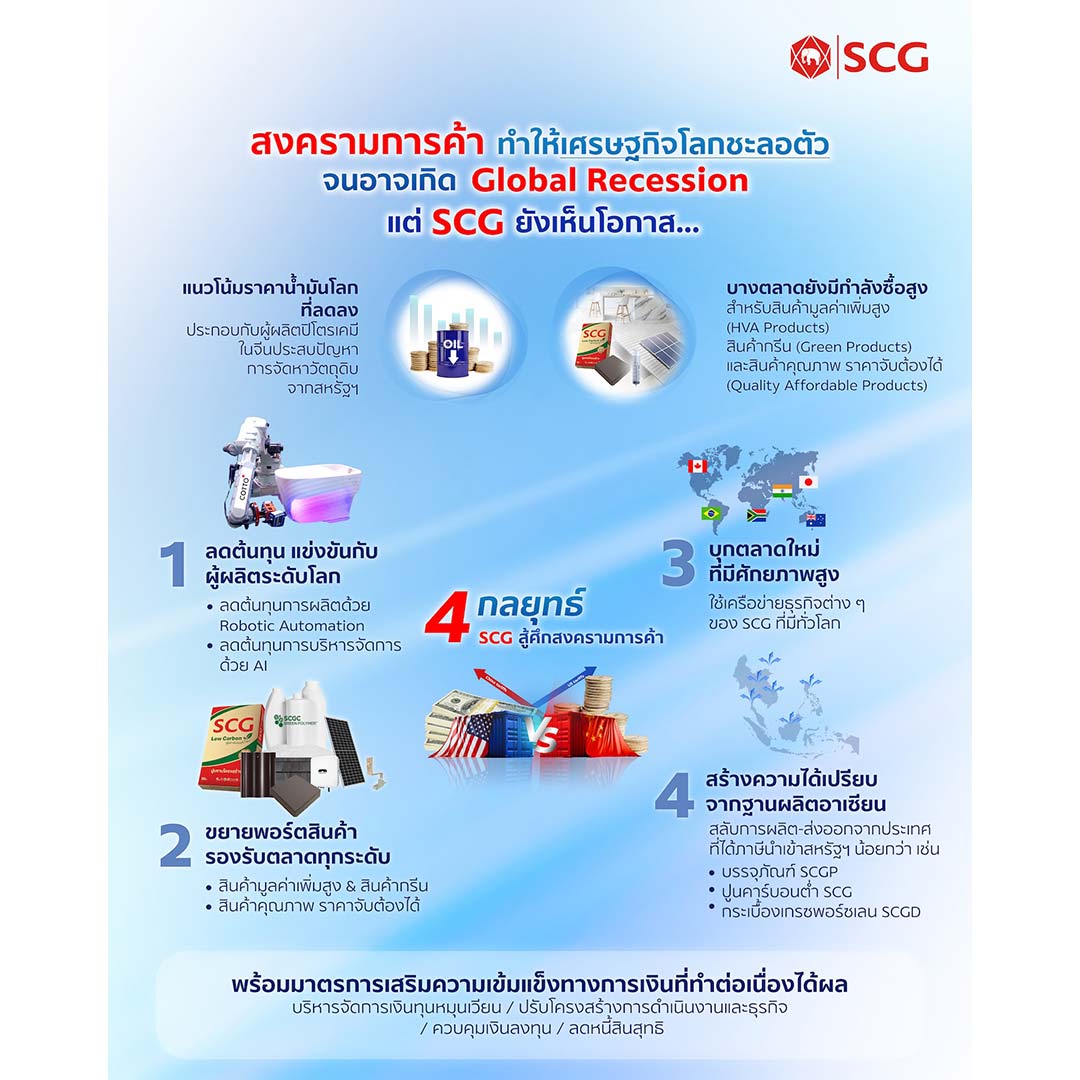 เอสซีจี ได้ประเมินสถานการณ์และผลกระทบจากสงครามการค้าโลก พบว่า 1.) ผลกระทบทางตรง ต่อเอสซีจี มีเล็กน้อย เนื่องจากในปี 2567 มีการส่งออกไปสหรัฐฯ เพียง 1% จากยอดขายรวมของเอสซีจี 2.) ผลกระทบทางอ้อม หากพ้นระยะที่สหรัฐฯ ประกาศชะลอการจัดเก็บภาษีนำเข้า 90 วัน กลุ่มประเทศที่เกินดุลการค้ากับสหรัฐฯ อาจถูกเก็บอัตราภาษีที่แตกต่างกัน โดยเฉพาะในประเทศไทย ที่อาจถูกเก็บอัตราภาษีนำเข้าสูงถึง 36% ตามที่สหรัฐฯ ประกาศเมื่อ 2 เมษายน 2568 จึงคาดการณ์ว่าเศรษฐกิจทั้งในระดับภูมิภาค และโลกจะชะลอตัวรุนแรง การส่งออกระหว่างประเทศ รวมถึงการทะลักของสินค้าจากประเทศอื่นเข้ามาในประเทศไทย จะส่งผลให้การแข่งขันรุนแรงยิ่งขึ้น”