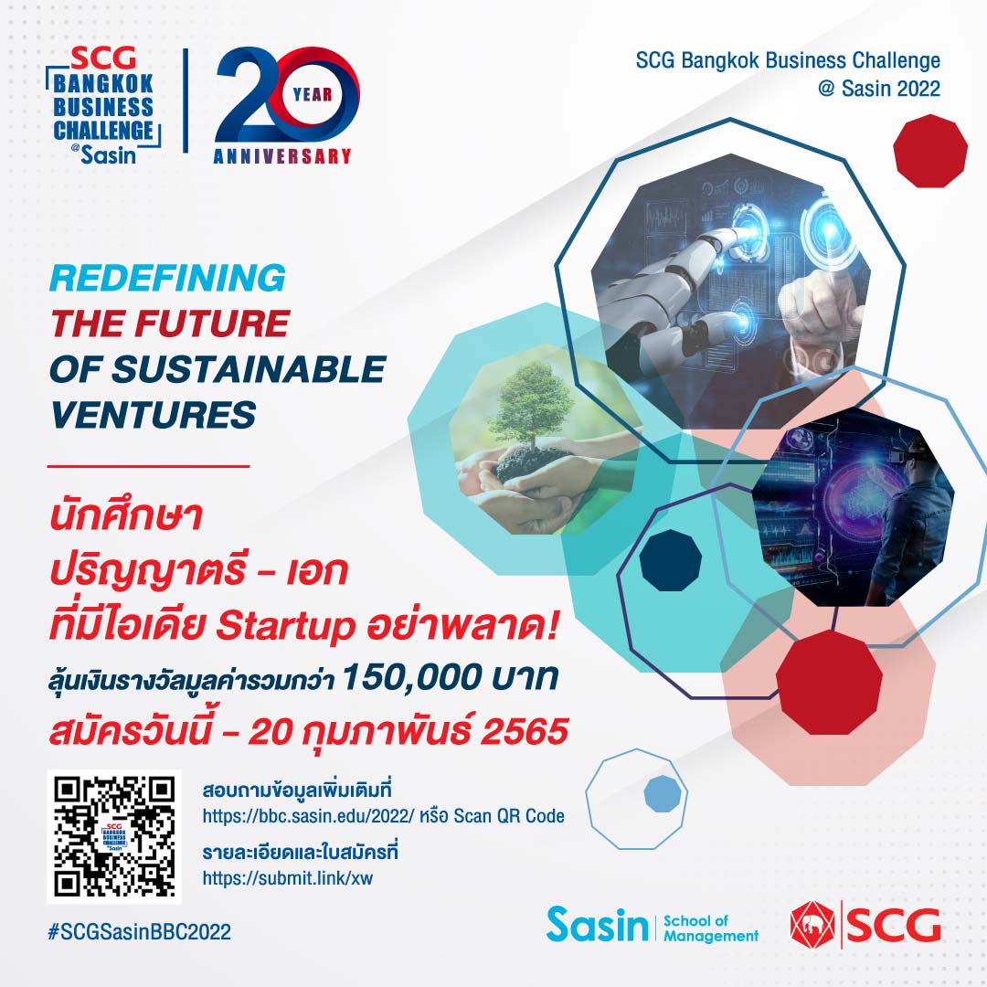 โอกาสสุดท้ายกับการเป็นหนึ่งในสุดยอดทีมพัฒนาแผนธุรกิจเพื่อตอบโจทย์สังคมและความยั่งยืนในการแข่งขัน SCG Bangkok Business Challenge @ Sasin 2022 (Thailand Competition) ชิงรางวัลรวมมูลค่ากว่า 150,000 บาท เปิดโอกาสให้นิสิตและนักศึกษาระดับปริญญาตรี โท และเอก ทุกสาขาจากมหาวิทยาลัยทั่วประเทศไทย ร่วมสร้างอนาคตผู้ประกอบการ ภายใต้แนวคิด “Redefining the Future of Sustainable Ventures” รีบสมัครทางออนไลน์ด่วน! ก่อนวันที่ 20 กุมภาพันธ์ 2565 นี้
