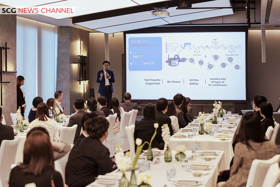 เอสซีจี นำโดย คุณวชิระชัย คูนำวัฒนา Head of Smart System Solution Business เอสซีจี ร่วมเปิดเวทีและพูดคุยในหัวข้อ “Clean Air for All” ซึ่งเป็นแนวคิดที่เอสซีจีให้ความสำคัญและทำมาอย่างต่อเนื่อง เพื่อให้สังคมเห็นความสำคัญของ ปัญหาด้านคุณภาพอากาศ ผ่านนวัตกรรม “SCG Bi-ion” ระบบไอออนกำจัดเชื้อโรคในอากาศ ร่วมกับกลุ่มลูกค้าและ Influencer ชื่อดัง ณ โรงแรมคิมป์ตันมาลัยกรุงเทพฯ หนึ่งในสถานที่ที่ติดตั้ง SCG Bi-ion