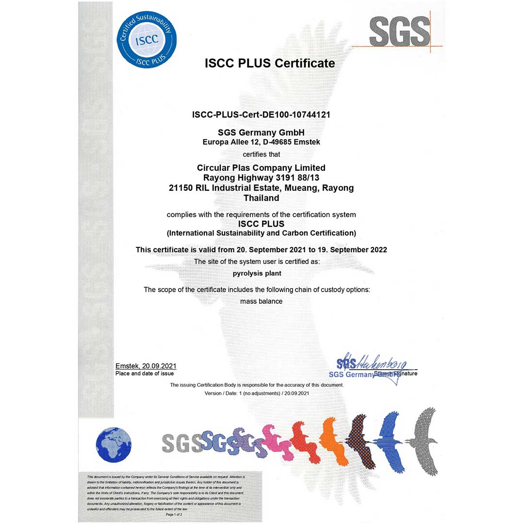 - บริษัท เซอร์คูลาร์ พลาส จำกัด ได้รับการรับรองมาตรฐาน ISCC PLUS ในขอบข่าย Processing Unit – Pyrolysis Plant เพื่อรับพลาสติกที่ใช้แล้วผ่านการรีไซเคิลโดยเทคโนโลยี Advanced Recycling นำมาผลิตเป็น Circular Naphtha