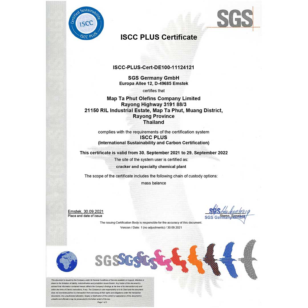 - บริษัท มาบตาพุดโอเลฟินส์ จำกัด ได้รับการรับรองมาตรฐาน ISCC PLUS ในขอบข่าย Co-processing Plant –Cracker Plant เพื่อรับวัตถุดิบ Circular Naphtha and Fossil feedstock มาผลิตเป็น Circular Product เช่น Circular Ethylene และ Circular Propylene
