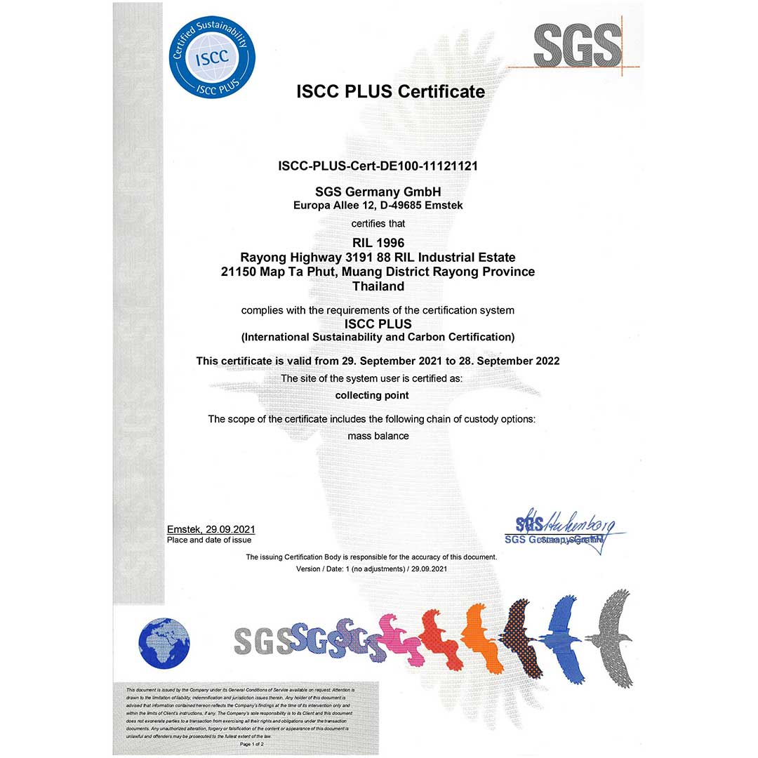 - บริษัท อาร์ ไอ แอล 1996 จำกัด ได้รับการรับรองมาตรฐาน ISCC PLUS ในขอบข่าย Collecting Point เพื่อจัดหารวบรวมพลาสติกใช้แล้ว ส่งต่อให้ผู้ประกอบการนำไปผลิตเป็นวัตถุดิบตั้งต้นสำหรับธุรกิจปิโตรเคมีต่อไป
