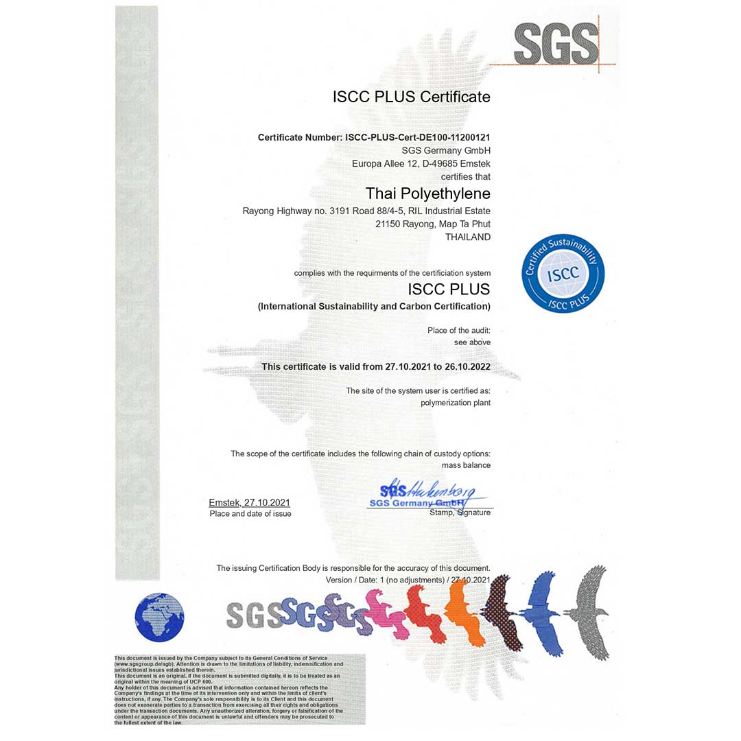 - บริษัท ไทยโพลิเอททีลีน จำกัด ได้รับการรับรองมาตรฐาน ISCC PLUS ในขอบข่าย Processing Unit – Polymerization Plant ที่ PP3 เพื่อรับวัตถุดิบ Circular Ethylene และ Circular Propylene มาผลิตเป็น Circular Polypropylene