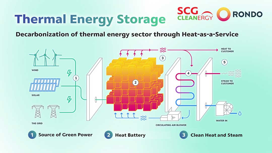 แบตเตอรี่ความร้อน Rondo จะเก็บกักไฟฟ้าที่ผลิตเป็นช่วงๆ สะสมพลังงานในรูปความร้อนอุณหภูมิสูงในอิฐ และจ่ายความร้อนและพลังงานอุตสาหกรรมอย่างต่อเนื่องตามความต้องการ การติดตั้งครั้งนี้ จะแปลงพลังงานแสงอาทิตย์ในท้องถิ่นเป็นความร้อน และพลังงานที่ปราศจากคาร์บอนอย่างต่อเนื่อง สำหรับโรงงานปูนซีเมนต์ของเอสซีจี ในจังหวัดสระบุรี ประเทศไทย