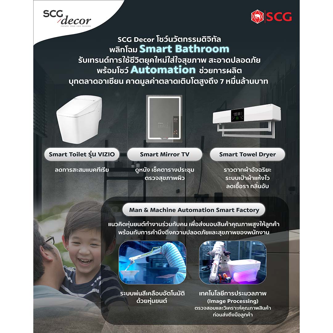 SCG Decor โชว์นวัตกรรมดิจิทัลพลิกโฉม Smart Bathroom รับเทรนด์การใช้ชีวิตยุคใหม่ใส่ใจสุขภาพ สะอาดปลอดภัย พร้อมโชว์เอไอ หุ่นยนต์ช่วยการผลิต เร่งบุกตลาดสุขภัณฑ์อาเซียน คาดมูลค่าตลาดสูงถึง 7 หมื่นล้านบาท