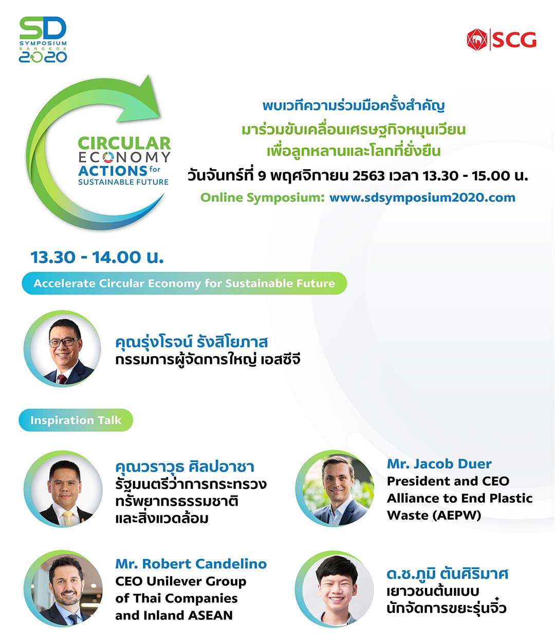 เอสซีจี จัดงานสัมมนาออนไลน์ระดับโลก “SD Symposium 2020” (Sustainable Development Symposium 2020) ภายใต้แนวคิด “Actions for Sustainable Future” ให้ผู้บริหารทั้งภาครัฐและเอกชน ผู้ประกอบการ SMEs นักวิชาการ และคนรุ่นใหม่ที่สนใจ ได้เรียนรู้แลกเปลี่ยนมุมมองกับองค์กรชั้นนำระดับโลก หน่วยงานภาครัฐและภาคประชาสังคมของไทย ตลอดจนชุมชนในท้องถิ่นที่นำแนวคิดเศรษฐกิจหมุนเวียน (Circular Economy) ไปปรับใช้ โดยมีเป้าหมายในการสร้างความตระหนักและร่วมผลักดันให้เกิดการใช้ทรัพยากรอย่างมีประสิทธิภาพสูงสุด ตั้งแต่กระบวนการผลิตจนถึงการบริโภค ซึ่งจะสามารถช่วยสร้างการเติบโตอย่างสมดุลของการดำเนินธุรกิจ การยกระดับคุณภาพชีวิต และอนาคตของโลกที่ยั่งยืน พร้อมสร้างเครือข่ายให้เกิดการพัฒนาอย่างยั่งยืนในภูมิภาคต่อไป