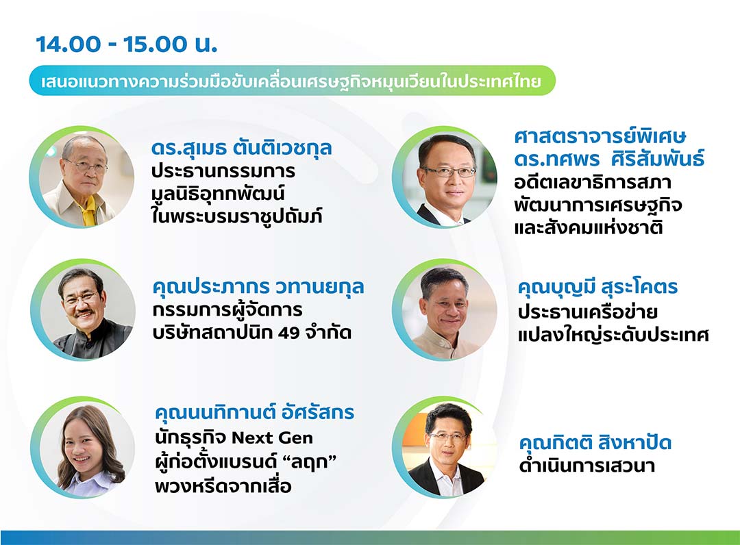 งานดังกล่าวได้รับเกียรติจาก คุณวราวุธ ศิลปอาชา รัฐมนตรีว่าการกระทรวงทรัพยากรธรรมชาติและสิ่งแวดล้อม ที่จะมาแสดงวิสัยทัศน์ของภาครัฐในการร่วมขับเคลื่อนแนวคิดเศรษฐกิจหมุนเวียน เพื่อสร้างการเติบโตอย่างยั่งยืนให้กับประเทศ รวมทั้ง Mr.Jacob Duer ประธานกรรมการและผู้บริหาร Alliance to End Plastic Waste (AEPW) และ Mr. Robert Candelino ผู้บริหาร Unilever Group of Thai Companies and Inland ASEAN ที่จะมาสร้างความเข้าใจเกี่ยวกับแนวคิดเศรษฐกิจหมุนเวียนและสถานการณ์ในบริบททั่วโลก นอกจากนี้ ยังมีการเสวนาถอดบทเรียนความสำเร็จและร่วมเสนอแนวทางความร่วมมือขับเคลื่อนเศรษฐกิจหมุนเวียนเพื่อให้หน่วยงานและชุมชนต่าง ๆ สามารถนำองค์ความรู้ไปประยุกต์ใช้ได้อย่างมีประสิทธิภาพ นำโดย ดร.สุเมธ ตันติเวชกุล ประธานกรรมการมูลนิธิอุทกพัฒน์ในพระบรมราชูปถัมภ์ และ ศาสตราจารย์พิเศษ ดร.ทศพร ศิริสัมพันธ์ อดีตเลขาธิการสภาพัฒนาการเศรษฐกิจและสังคมแห่งชาติ โดยมี คุณรุ่งโรจน์ รังสิโยภาส กรรมการผู้จัดการใหญ่ เอสซีจี ร่วมกล่าววัตถุประสงค์การจัดงาน ความคืบหน้าและตัวอย่างความสำเร็จของการขับเคลื่อนเศรษฐกิจหมุนเวียนตลอด 3 ปีที่ผ่านมา ตลอดจนพันธกิจและเป้าหมายในการขับเคลื่อนแนวคิดเศรษฐกิจหมุนเวียนของเอสซีจี