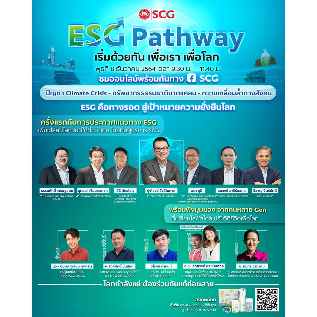 แนวคิด ESG ที่ทั่วโลกให้ความสนใจ และการปรับเปลี่ยนวิถีชีวิตของเรา จะช่วยแก้วิกฤตโลกได้อย่างไร ร่วมหาคำตอบได้ในงาน “SCG ESG Pathway เริ่มด้วยกัน เพื่อเรา เพื่อโลก” วันพุธที่ 8 ธ.ค. 2564 นี้ ตั้งแต่ 09.30 – 11.40 น. ผ่านช่องทางออนไลน์ที่ Facebook SCG: https://www.facebook.com/SCGofficialpage โดยสามารถลงทะเบียนร่วมงานได้ที่ https://bit.ly/SCGESGPathway สำหรับผู้ที่รับชม Live มีสิทธิ์ลุ้นรับ Almind สเปรย์แอลกอฮอลล์ล้างมือสูตรอ่อนโยน จาก SCGP