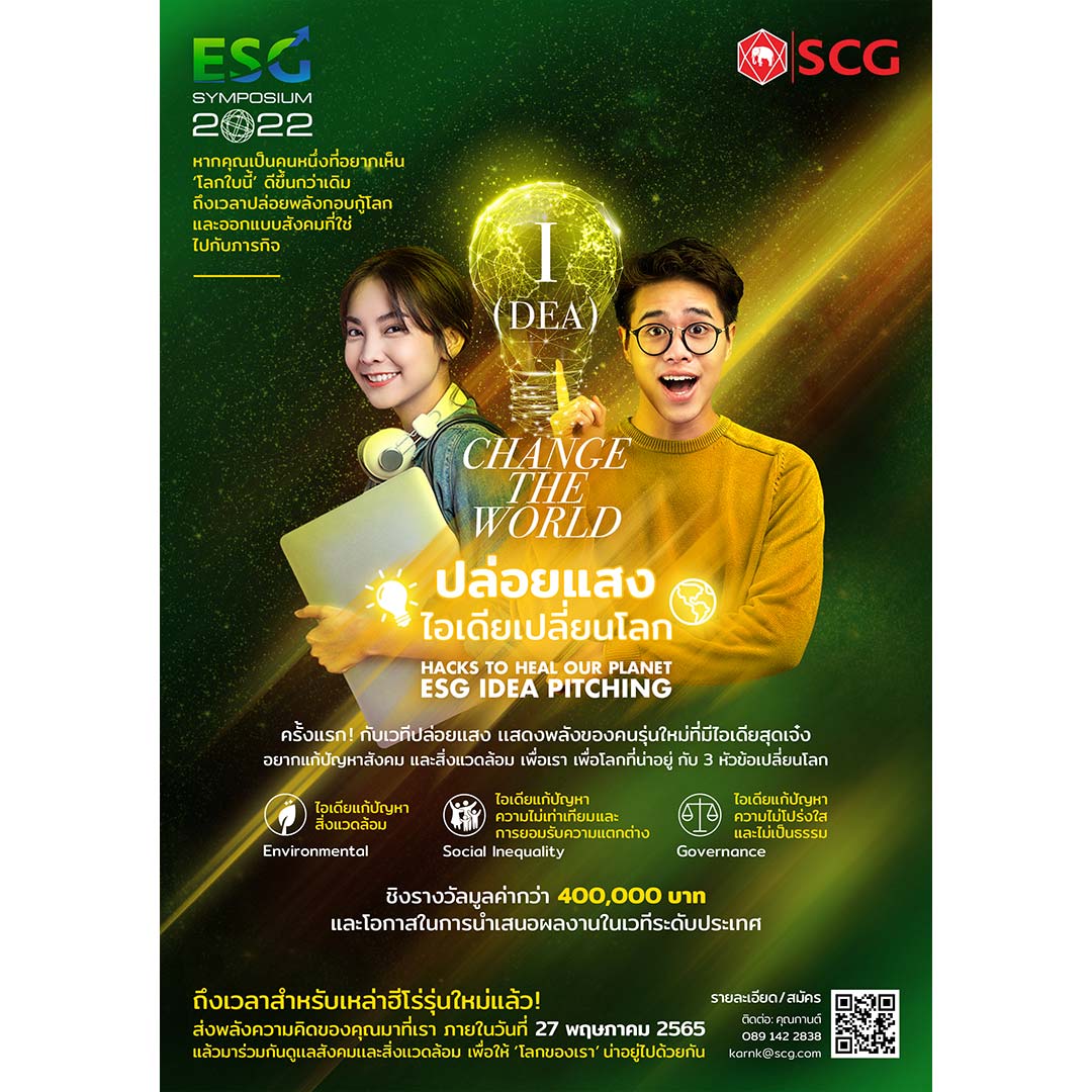 เอสซีจี ให้ความสำคัญต่อการแก้ปัญหาวิกฤตโลก มุ่งสร้างสมดุลในทุกมิติ ด้วยแนวทางการพัฒนาอย่างยั่งยืน ทั้งด้านสิ่งแวดล้อม สังคม และบรรษัทภิบาล หรือ ESG (Environmental, Social, Governance) สอดคล้องกับเป้าหมายการพัฒนาที่ยั่งยืน SDGs (Sustainable Development Goals) ของสหประชาชาติ และโมเดลเศรษฐกิจใหม่สู่การพัฒนาที่ยั่งยืนของไทย หรือ BCG Economy (Bio-Circular-Green Economy) จัดการประกวด “ปล่อยแสง ไอเดียเปลี่ยนโลก” เพื่อเปิดพื้นที่ให้คนรุ่นใหม่แสดงศักยภาพ ร่วมนำเสนอแนวคิดที่เป็นไปได้ กับ 3 หัวข้อ เปลี่ยนโลก