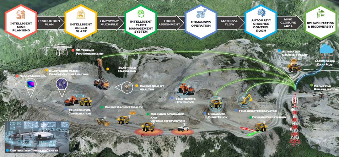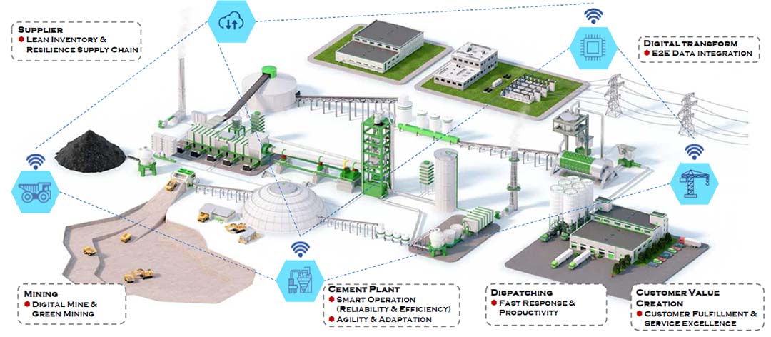 เริ่มจากการวางโครงข่ายระบบ 5G ในการบริหารจัดการเหมือง และการใช้พาหนะไร้คนขับ (Unmanned Truck) ในงานที่มีความเสี่ยง การใช้อากาศยานไร้คนขับ (Drone) ในการวางแผนการทำเหมืองและวัดพื้นที่กองวัตถุดิบ การใช้เทคโนโลยีแบบจำลองสารสนเทศหรือ BIM (Building Information Modeling) ในการทำฐานข้อมูลของ Digital Twin โดยดึงข้อมูลสารสนเทศต่างๆ เช่น ข้อมูลการผลิต ข้อมูลเครื่องจักร ข้อมูลคุณภาพสินค้า ข้อมูลระบบงานซ่อม ผ่านอุปกรณ์ IoT (Internet of Things) ให้เป็น Single Source of Data  ตลอดจนการส่งต่อข้อมูลสารสนเทศ ในการวางแผนวัตถุดิบ การวางแผนระบบขนส่ง จนถึงกระบวนการผลิตและจ่ายสินค้า ทำให้เกิดการสอดประสานความสอดคล้องของข้อมูล ช่วยให้การวางแผนการดำเนินการเป็นภาพเดียวกันตอบรับกับการทำงานแบบ Hybrid Workplace บน Digital Platform
