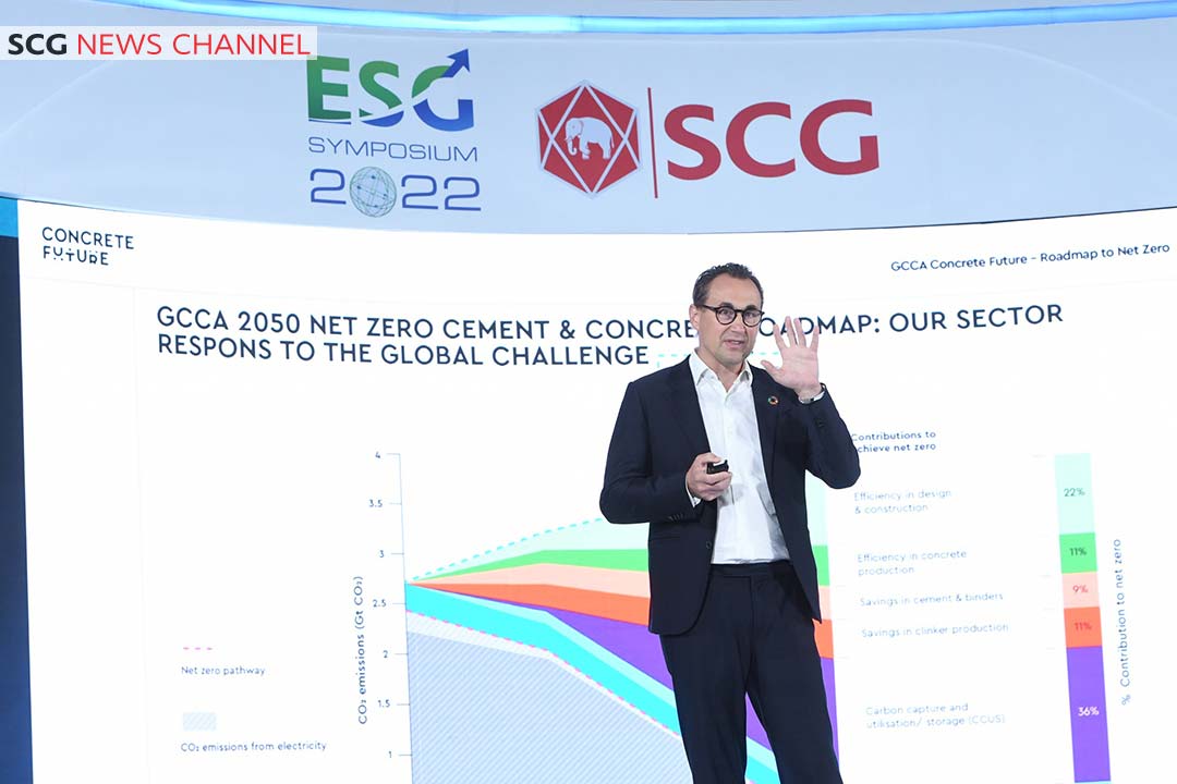 นายรุ่งโรจน์ รังสิโยภาส กรรมการผู้จัดการใหญ่ เอสซีจี เปิดเผยในงาน ESG Symposium 2022 :Achieving ESG and Growing Sustainability ว่า “เอสซีจีได้ยกระดับ SD Symposium ที่จัดต่อเนื่องเป็นปีที่ 11 สู่  ESG Symposium เพื่อขยายพลังความร่วมมือตามแนวทาง ESG ซึ่งเป็นทางรอดเดียวที่จะช่วยแก้วิกฤตซ้ำซ้อนที่กำลังเผชิญอยู่ โดยที่ผ่านมาเวทีดังกล่าว ได้ผลักดันความร่วมมือจากระดับโลก เชื่อมโยงสู่ระดับประเทศเพื่อสร้างการเปลี่ยนแปลงและแก้ไขวิกฤตที่เกิดผลเป็นรูปธรรม เช่น ความร่วมมือสร้าง Roadmap ในการลดการปล่อยก๊าซเรือนกระจกสุทธิเป็นศูนย์ของอุตสาหกรรมซีเมนต์และคอนกรีตในประเทศไทยกับสมาคมซีเมนต์และคอนกรีตโลก (Global Cement and Concrete Association  GCCA) เพื่อขับเคลื่อนอุตสาหกรรมปูนซีเมนต์ของไทย ให้ดำเนินนโยบายบรรลุเป้าหมาย ลดการปล่อยก๊าซเรือนกระจกเป็นศูนย์ในปี 2050 ให้เป็นทิศทางเดียวกับระดับโลก พร้อมเตรียมนำแผนงานดังกล่าวเสนอต่อที่ประชุม COP 27 ในเดือนพฤศจิกายนนี้ที่ประเทศอียิปต์ นอกจากนี้ ยังมีความร่วมมือแก้ปัญหาขยะพลาสติกในมหาสมุทรอย่างยั่งยืนกับ Alliance to End Plastic Waste AEPW ซึ่งเป็นองค์กรไม่แสวงหาผลกำไรระดับโลก ที่เกิดจากความร่วมมือของกลุ่มบริษัทที่ทำงานร่วมกันในห่วงโซ่ ของอุตสาหกรรมพลาสติก ตั้งแต่ผู้ผลิต ผู้จำหน่าย ผู้บริโภค จนถึงผู้ที่จัดการพลาสติกหลังจากใช้แล้ว เป็นต้น”