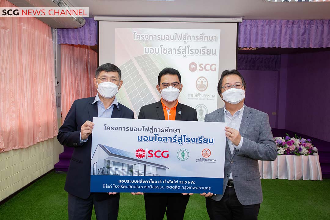 “เอสซีจี โซลาร์รูฟ โซลูชั่น” จับมือ การไฟฟ้านครหลวง และ กรุงเทพมหานคร มอบระบบหลังคาโซลาร์ 23.5 kW. ผ่านโครงการมอบไฟสู่การศึกษา มอบโซลาร์สู่โรงเรียน ให้แก่โรงเรียนวัดประชาระบือธรรม เขตดุสิต กรุงเทพมหานคร ส่งเสริมให้มีการใช้พลังงานสะอาดเพิ่มมากขึ้น โดยเฉพาะในแต่ละชุมชน ซึ่งในโครงการนี้เราเริ่มต้นจากโรงเรียนวัดประชาระบือธรรม เขตดุสิต กรุงเทพมหานคร เพราะเล็งเห็นว่าโรงเรียนเป็นแหล่งการศึกษาที่จะเป็นจุดเรียนรู้ได้เป็นอย่างดี ถือเป็นโรงเรียนและชุมชนต้นแบบ ในการใช้พลังงานสะอาด รวมถึงเป็นการช่วยลดค่าใช้จ่ายด้านค่าไฟฟ้าได้อย่างยั่งยืน